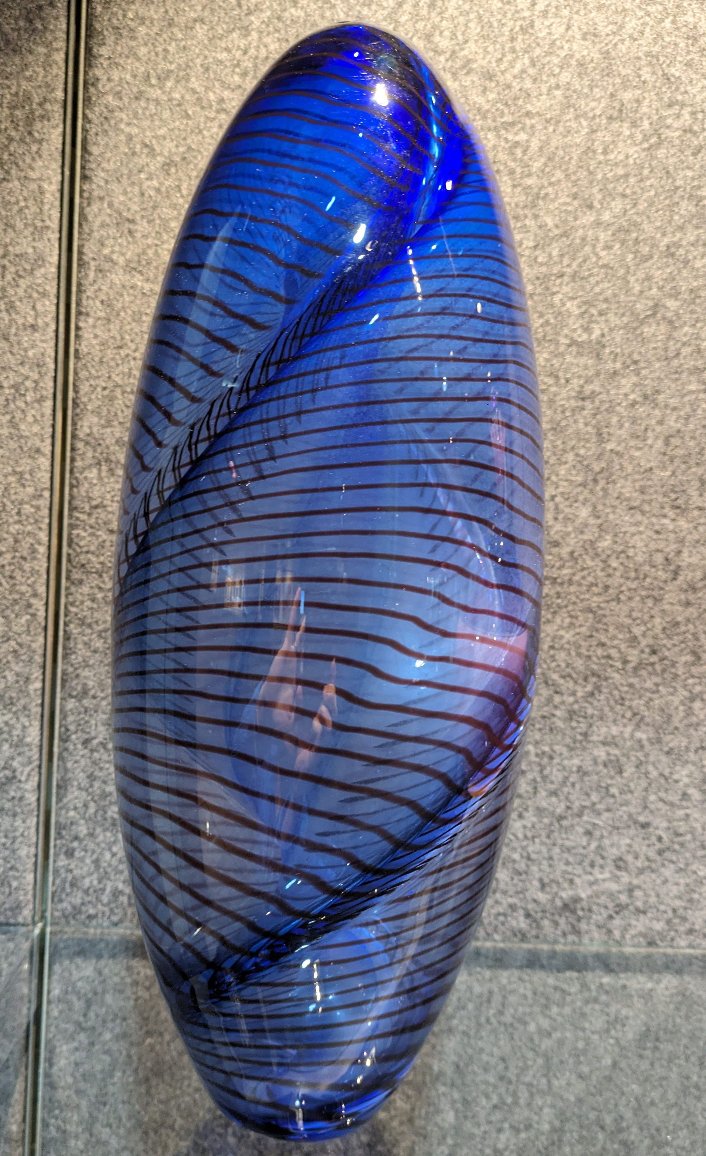 Few glass artists are as well-respected as Lino Tagliapietra. Born in Murano, Italy, he began his glass apprenticeship at age 11 and ascended to the rank of maestro at age 21. In 1968, Tagliapietra shared guarded Muranese glassmaking techniques with Dale Chihuly, marking an unprecedented collaboration. This blue, ovoid shaped vase is decorated with a black, swirling, filagree pattern.