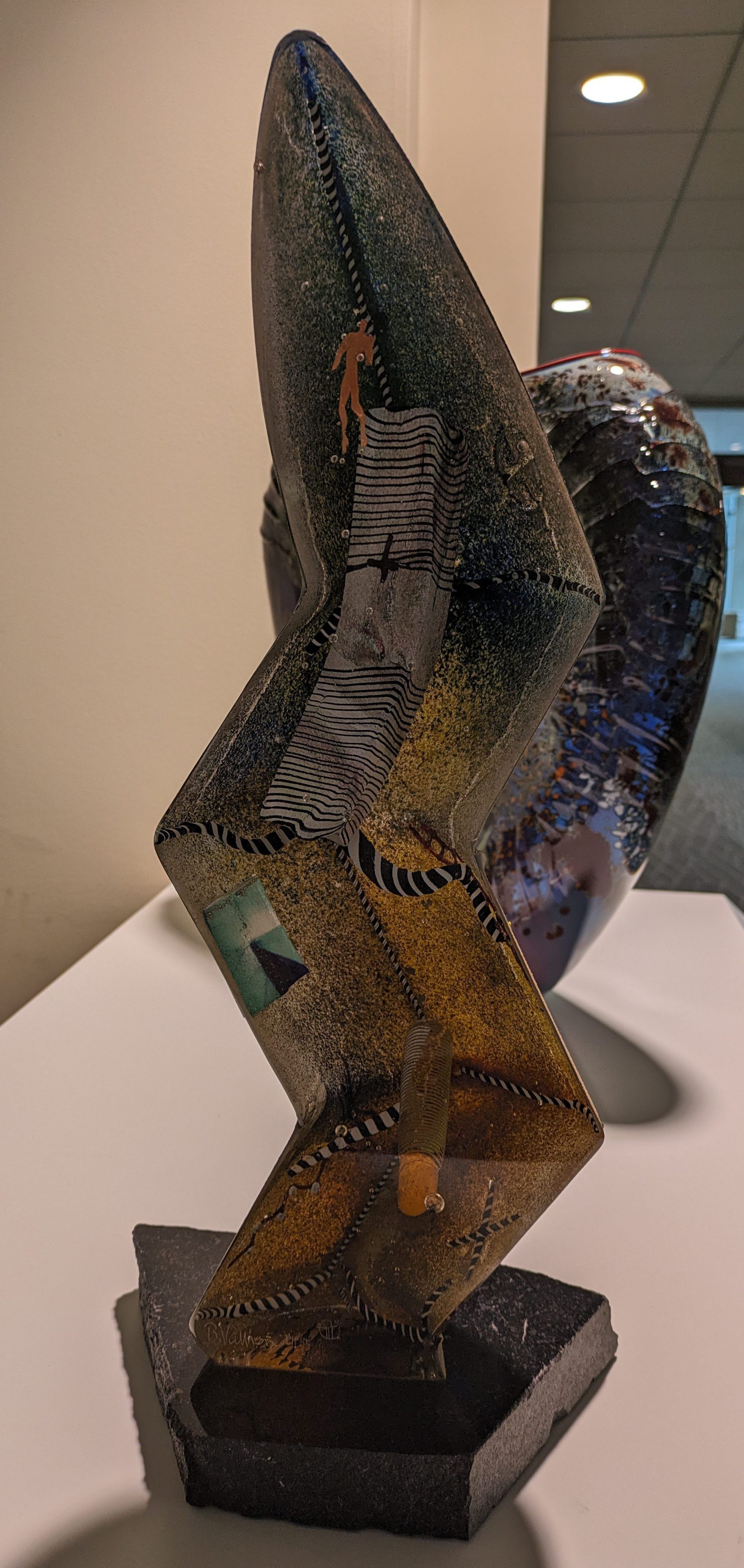 Bertil Vallien is the most widely recognized Swedish glass artist. He pioneered the sand-casting technique in the 1980s, a process that entails pouring molten glass into a prepared bed of sand to create a form. He is best known for his sand-cast boats, inspired by Viking boat burials, which address the themes of journey, memory, and time. This meandering, boat-like, form holds objects as if suspended in a moment.