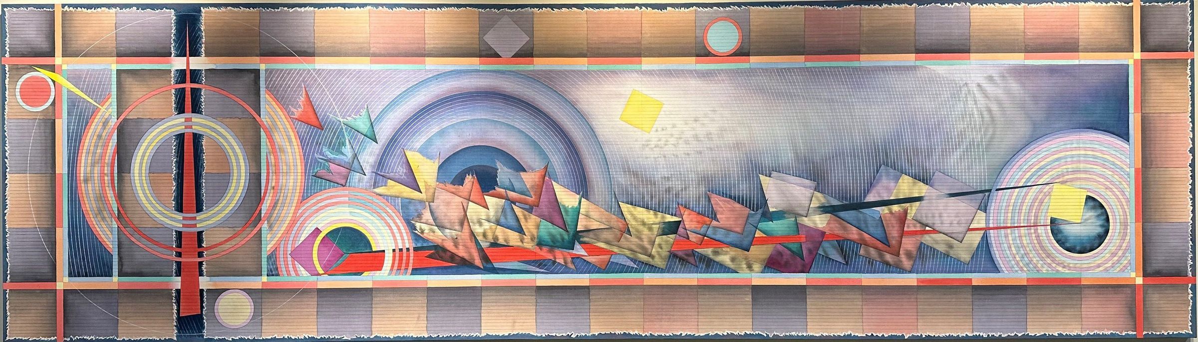 Geometric abstract painting, with pencil drawn lines, on unprimed canvas.