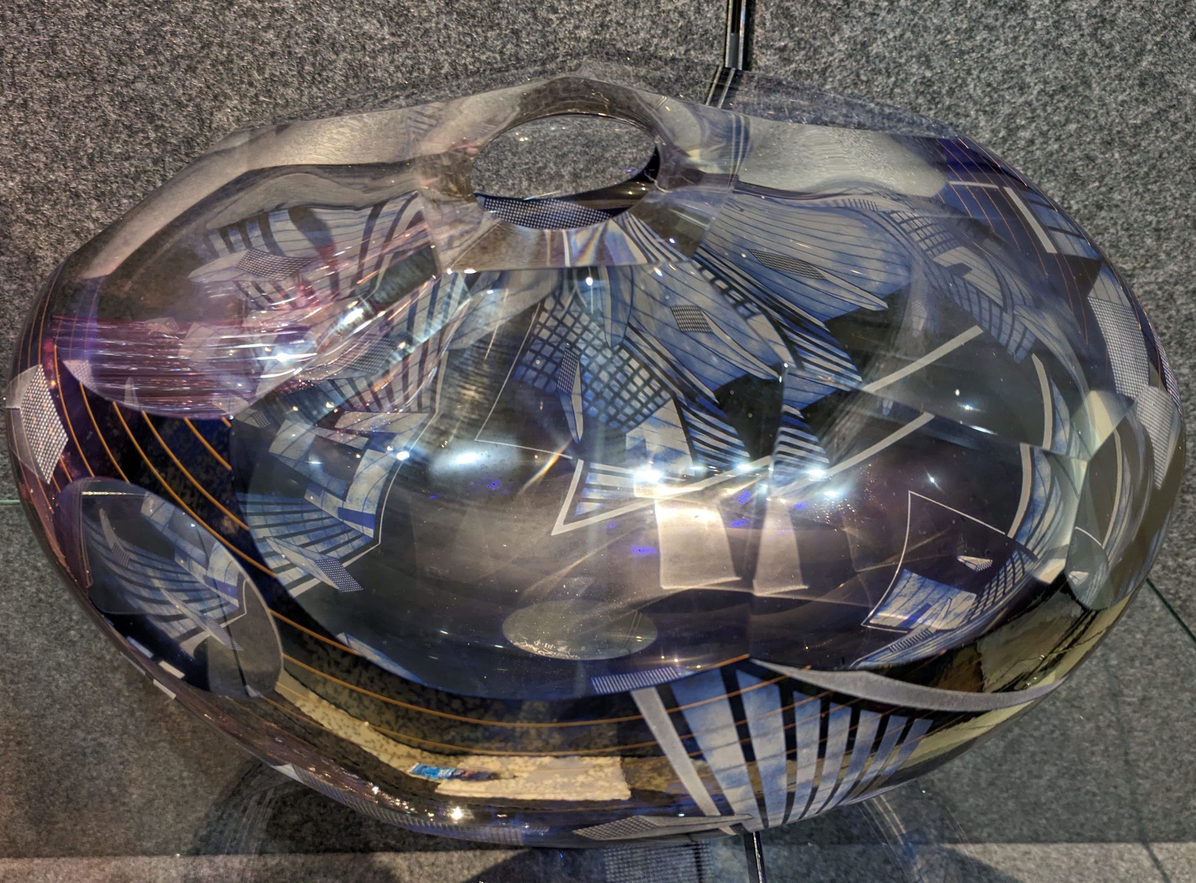 David Schwarz’s Z-Axis series represents the creation of the illusion of space, with the intent that the viewer explores both the exterior and interior of the artist’s world. The effect should be that of weightlessness. The artist’s hope is that the viewer falls into the work as if moving through the interior of an illusionary space. This blue, ovoid, faceted, form has abstract, geometric, decoration resembling architectural elements floating in space.
