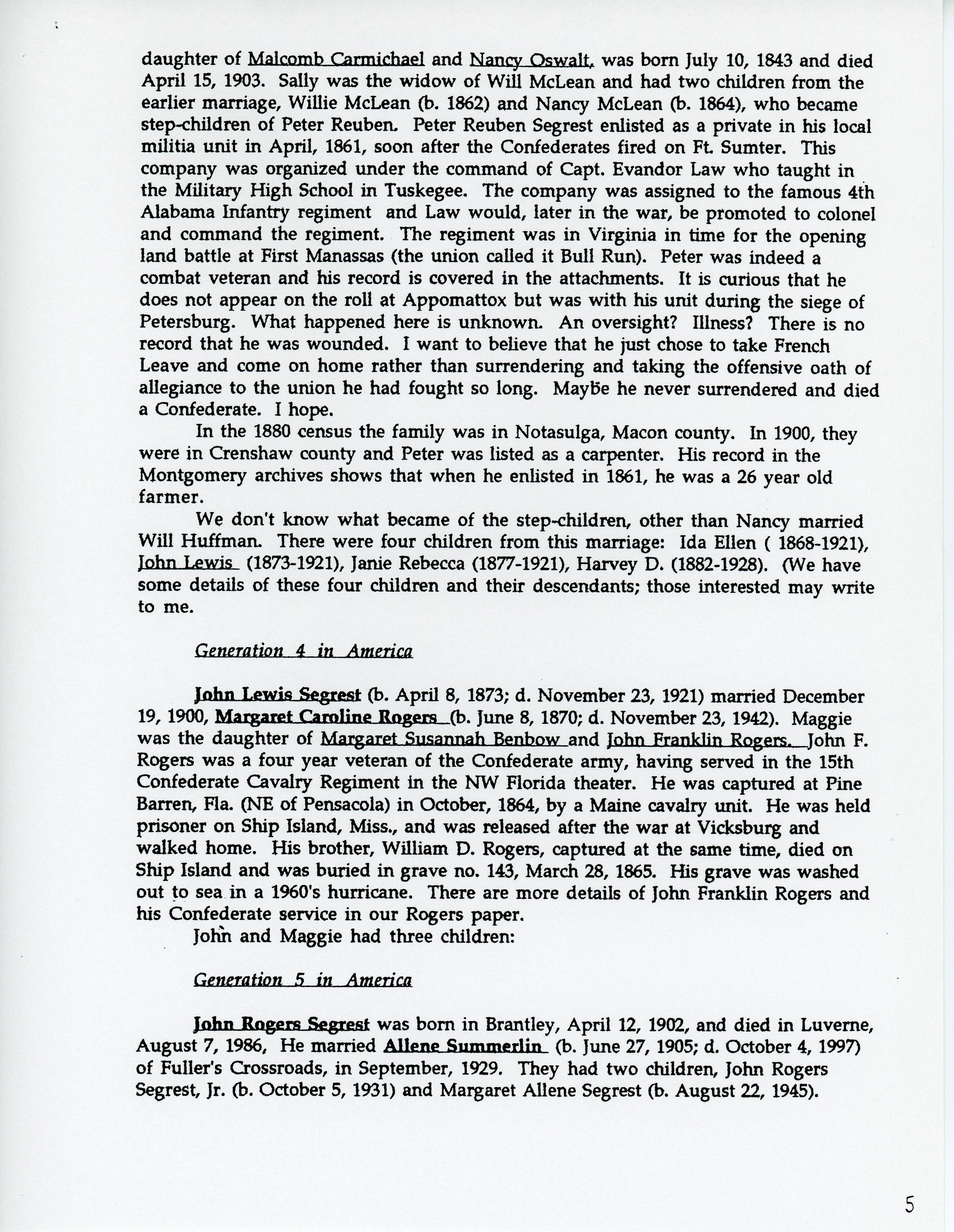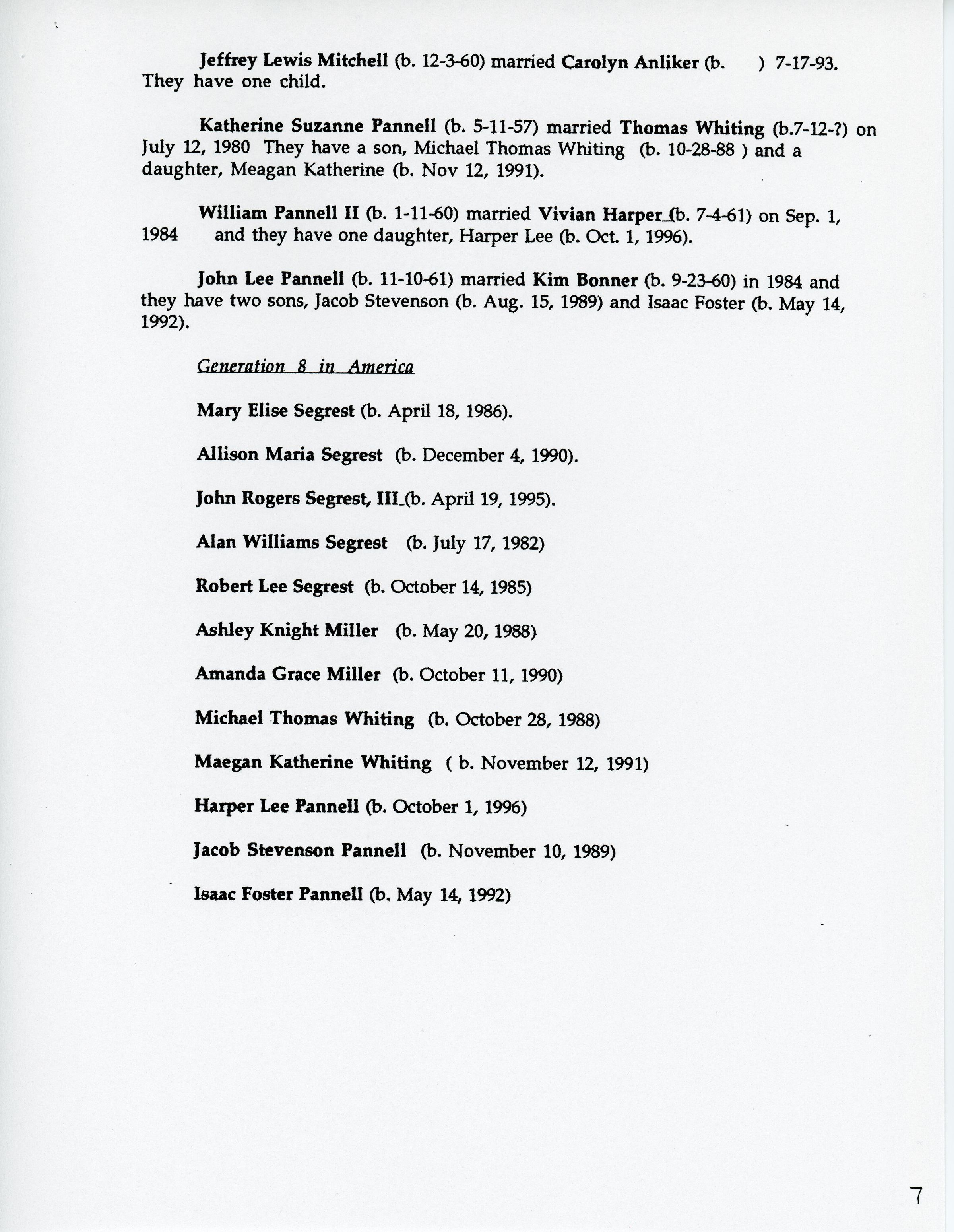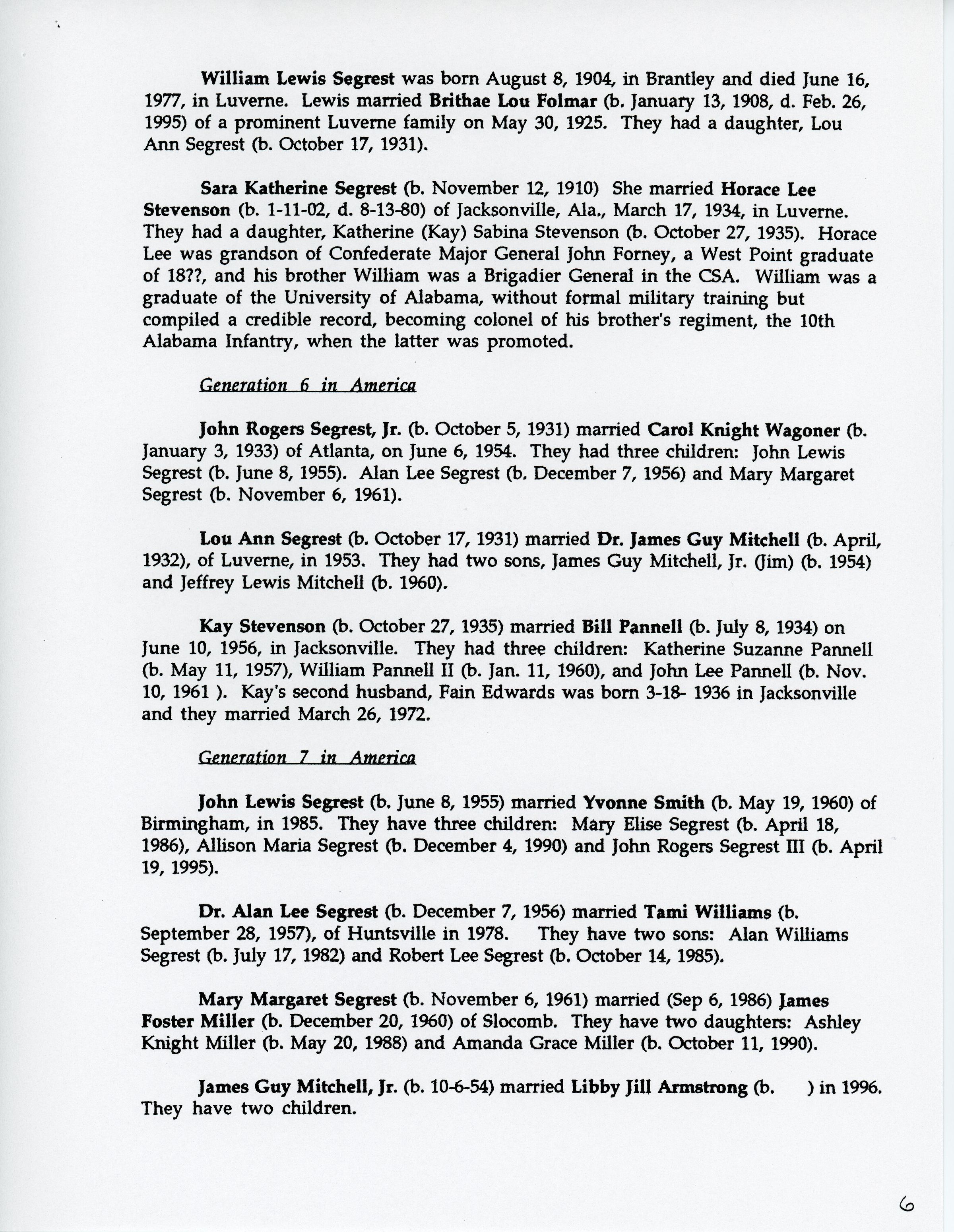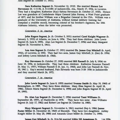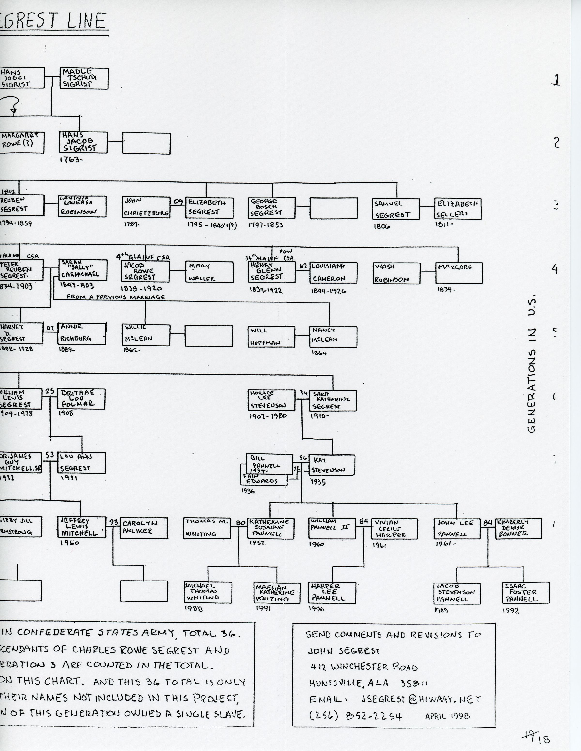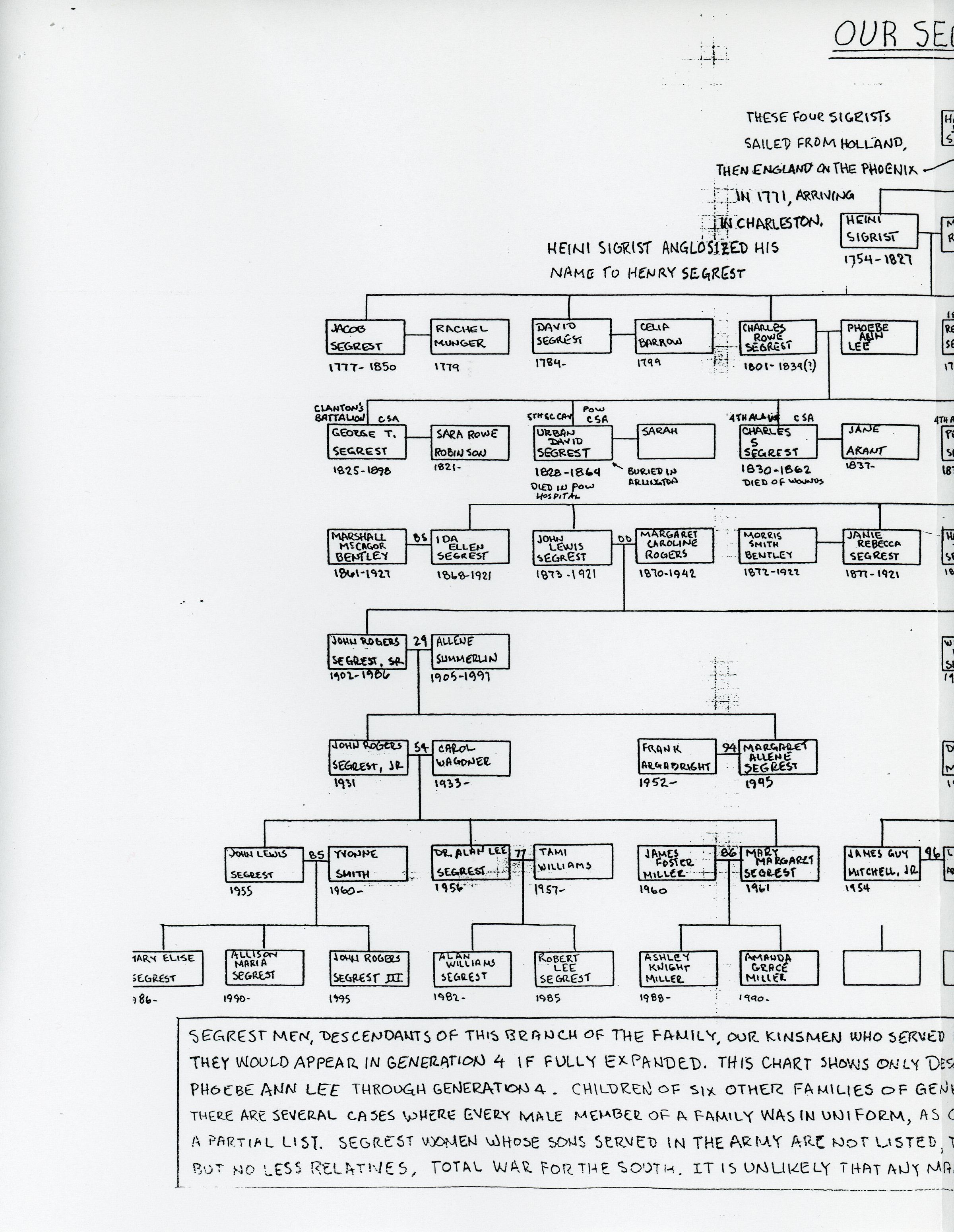 Henry Segrest, Margaret Rowe Segrest, Charles Rowe Segrest, Phoebe Ann Lee, Peter Reuben Segrest, Sarah Carmichael, John Lewis Segrest, Margaret Carolina Rogers, John Rogers Segrest Jr., John Rogers Segrest Sr., Allene Summerlin, William Lewis Segrest, Brithae Lou Folmar, Sara Katherine Segrest, Horace Lee Stevenson, Carol Wagoner Segrest, Lou Ann Segrest, James Guy Mitchell, Kay Stevenson, Bill Pannell, Yvonne Segrest, Alan Lee Segrest, Tami Segrest, Mary Margaret Miller, James Foster Miller, Libby Jill Armstrong, Jeffery Lewis Mitchell, Katherine Suzanne Pannell, Thomas Whiting, William Pannell II, Vivian Harper, John Lee Pannell, Kim Bonner, Mary Elise Segrest, Allison Maria Segrest, John Rogers Segrest III, Alan Williams Segrest, Robert Lee Segrest, Ashley Knight Miller, Grace Seidel, Michael Thomas Whiting, Maegan Katherine Whiting, Harper Lee Pannell, Jacob Stevenson Pannell, Isaac Foster Pannell, Carolyn Anliker