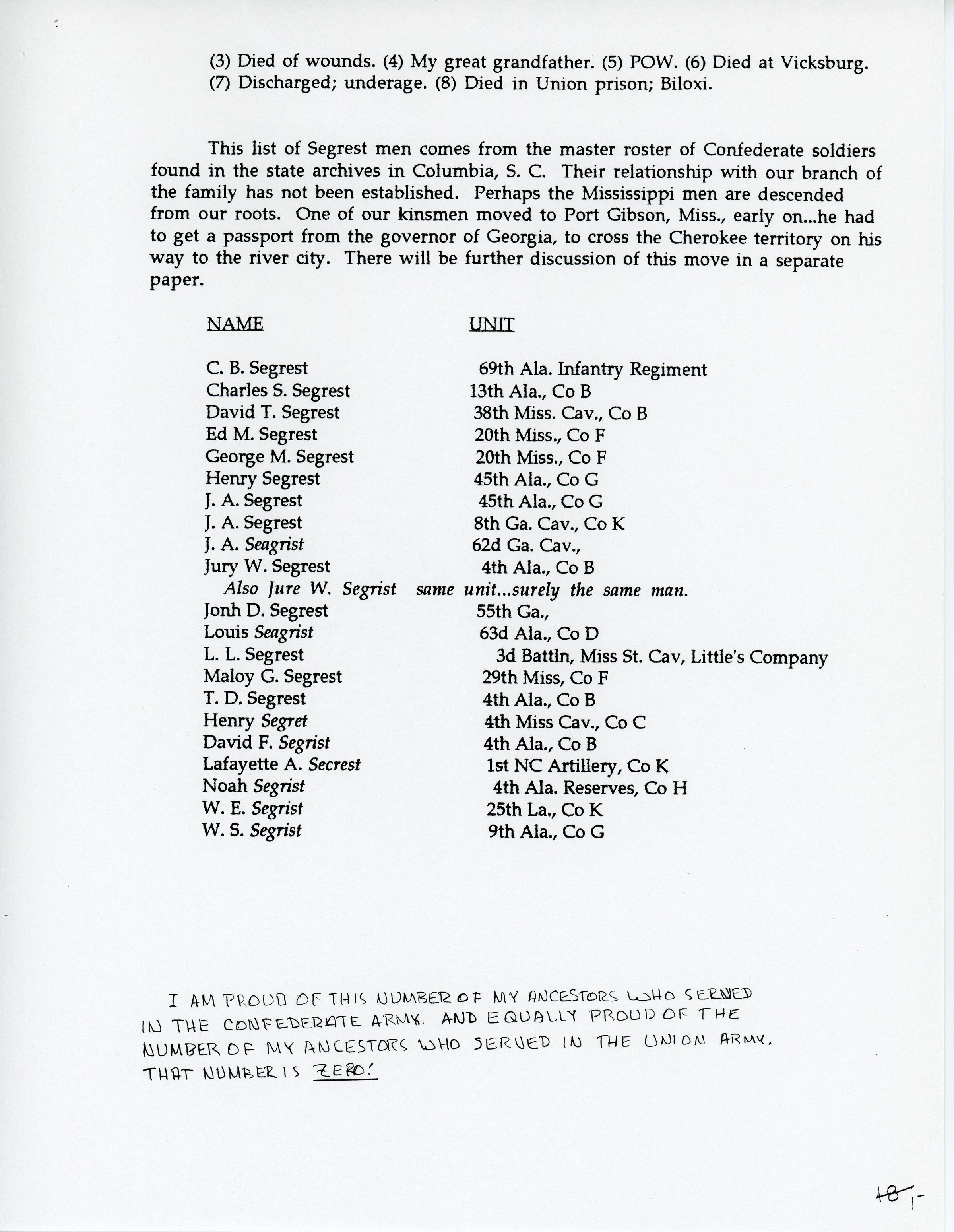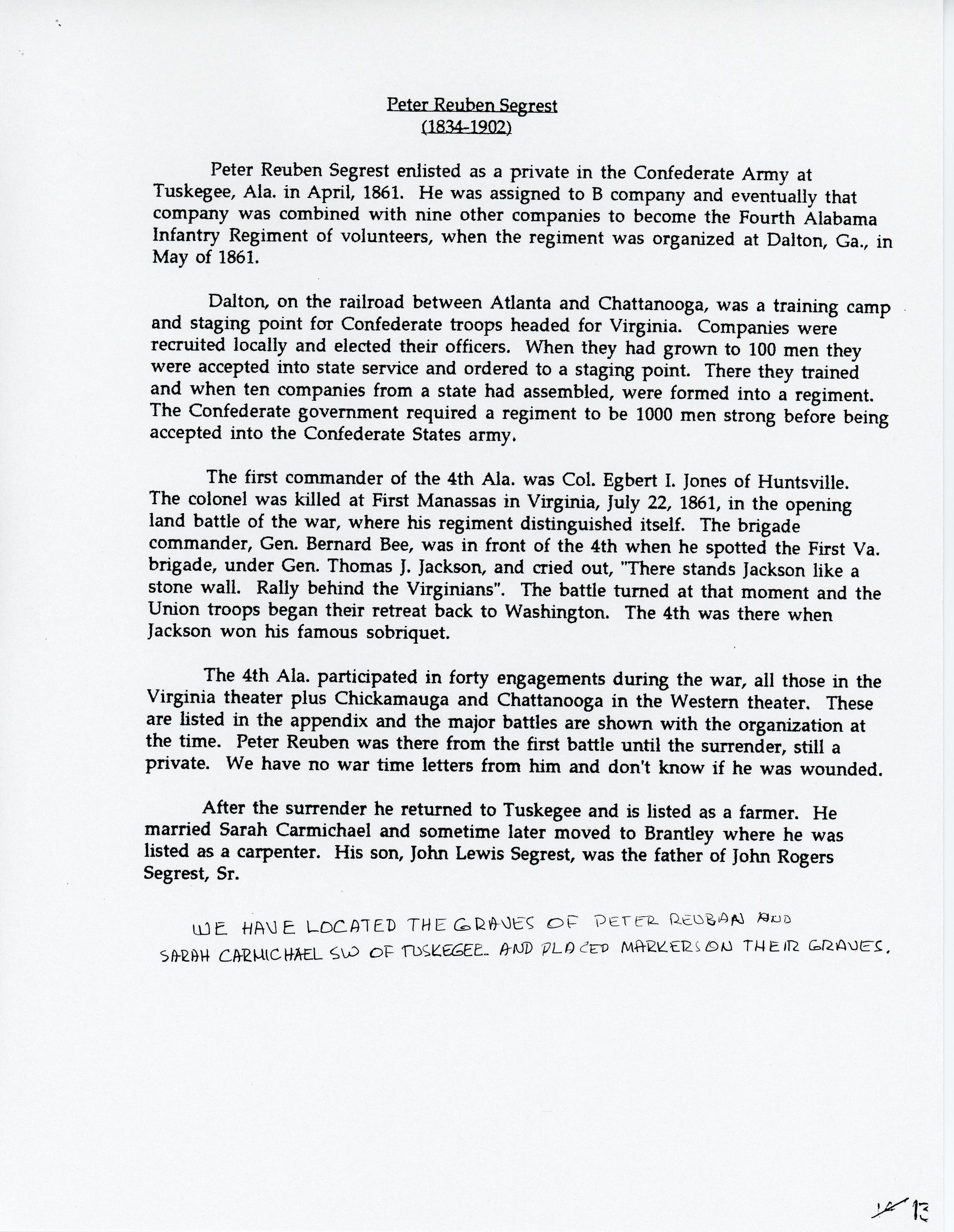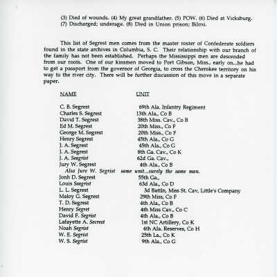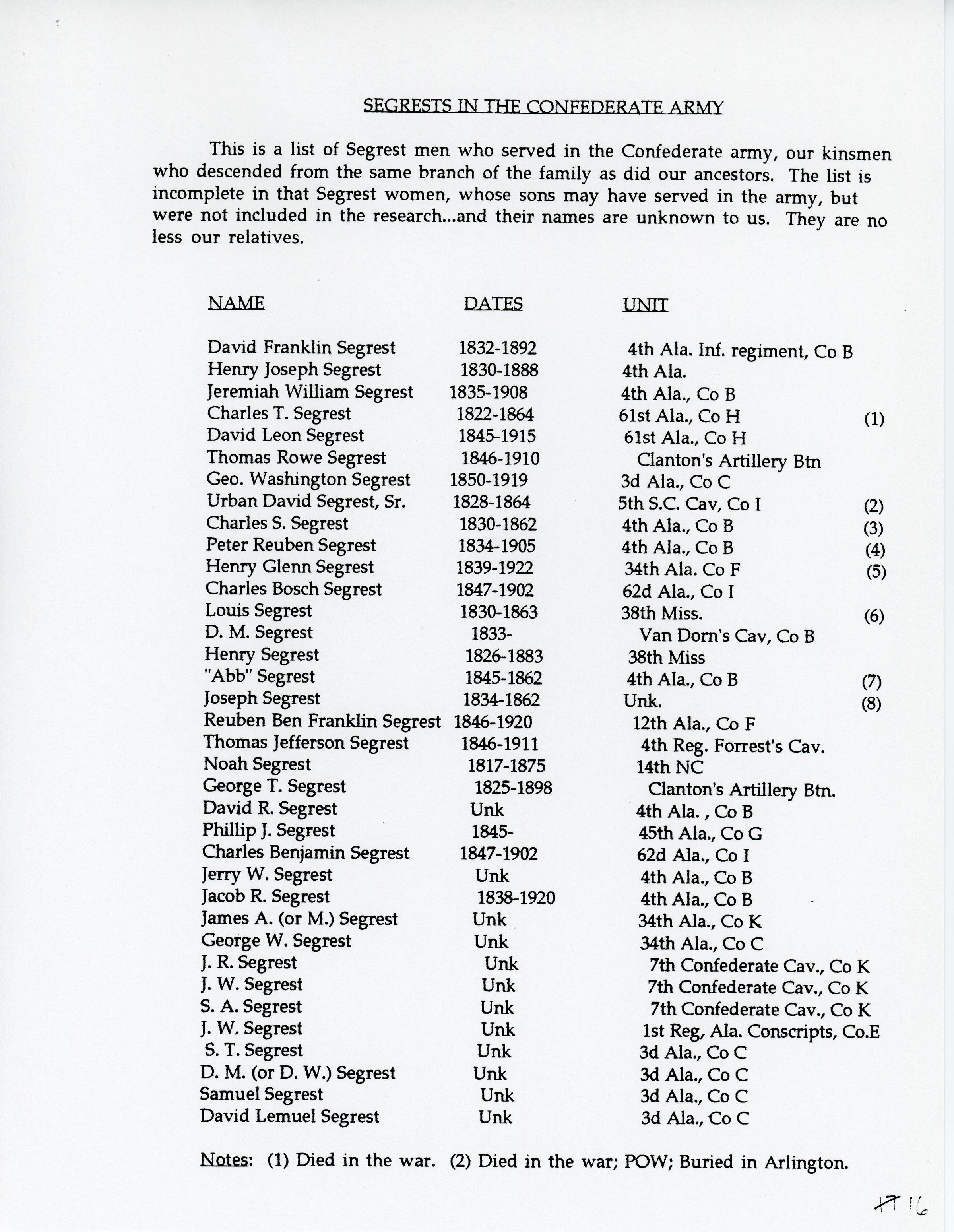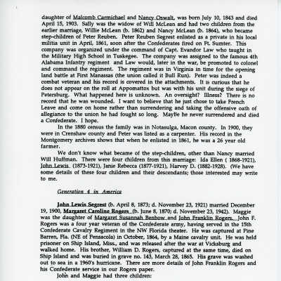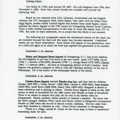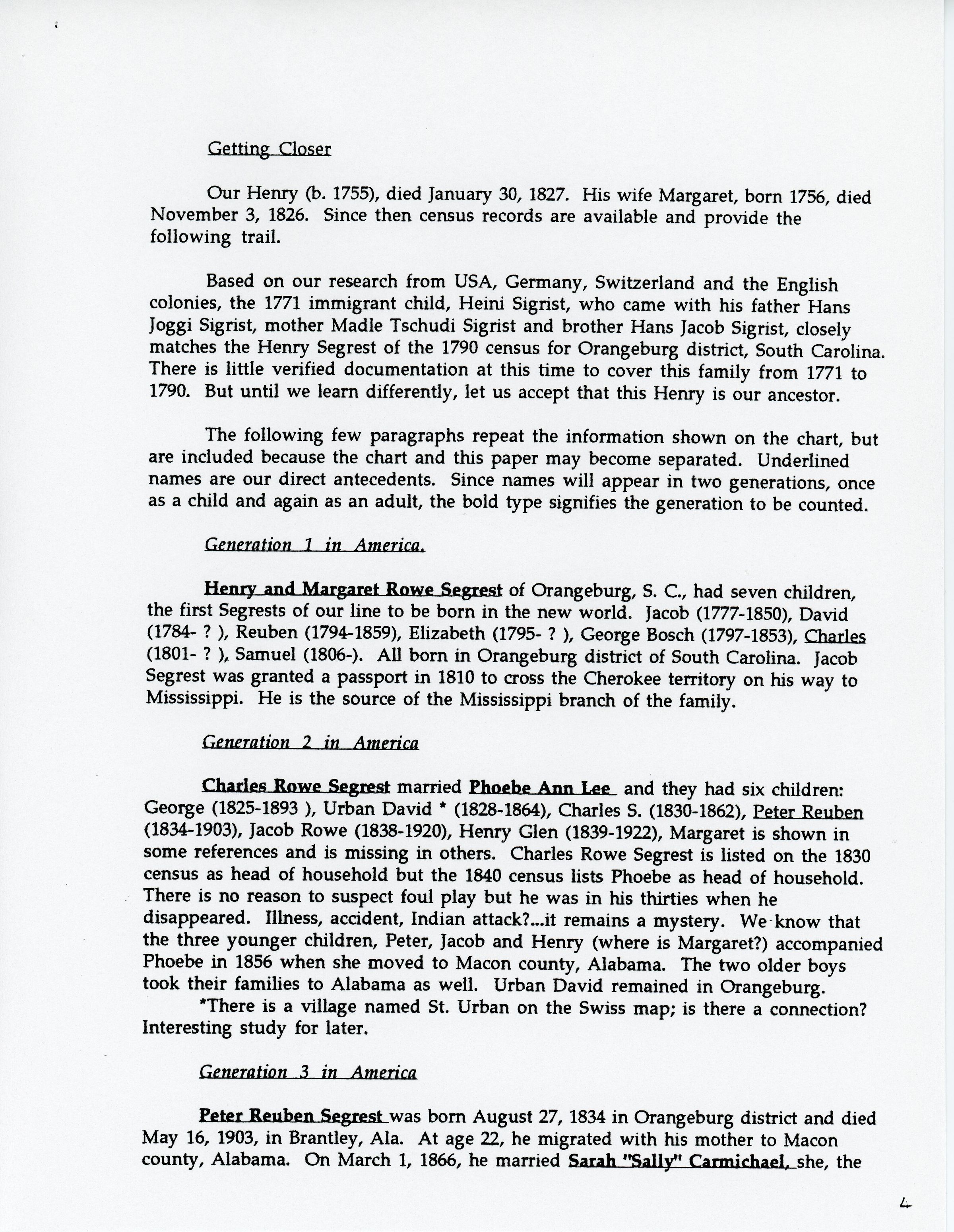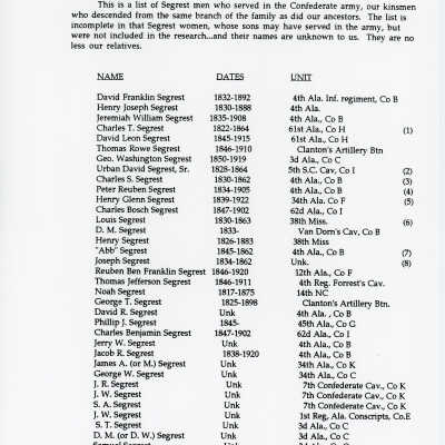 Henry Segrest, Margaret Rowe Segrest, Charles Rowe Segrest, Phoebe Ann Lee, Peter Reuben Segrest, Sarah Carmichael, John Lewis Segrest, Margaret Carolina Rogers, John Rogers Segrest Jr., John Rogers Segrest Sr., Allene Summerlin, William Lewis Segrest, Brithae Lou Folmar, Sara Katherine Segrest, Horace Lee Stevenson, Carol Wagoner Segrest, Lou Ann Segrest, James Guy Mitchell, Kay Stevenson, Bill Pannell, Yvonne Segrest, Alan Lee Segrest, Tami Segrest, Mary Margaret Miller, James Foster Miller, Libby Jill Armstrong, Jeffery Lewis Mitchell, Katherine Suzanne Pannell, Thomas Whiting, William Pannell II, Vivian Harper, John Lee Pannell, Kim Bonner, Mary Elise Segrest, Allison Maria Segrest, John Rogers Segrest III, Alan Williams Segrest, Robert Lee Segrest, Ashley Knight Miller, Grace Seidel, Michael Thomas Whiting, Maegan Katherine Whiting, Harper Lee Pannell, Jacob Stevenson Pannell, Isaac Foster Pannell, Carolyn Anliker