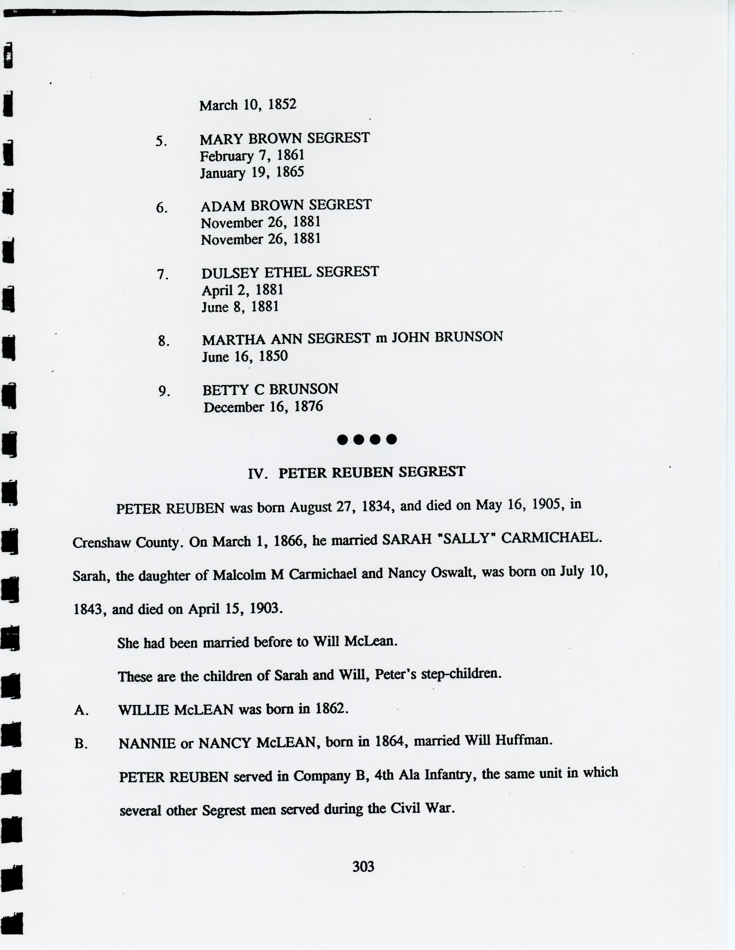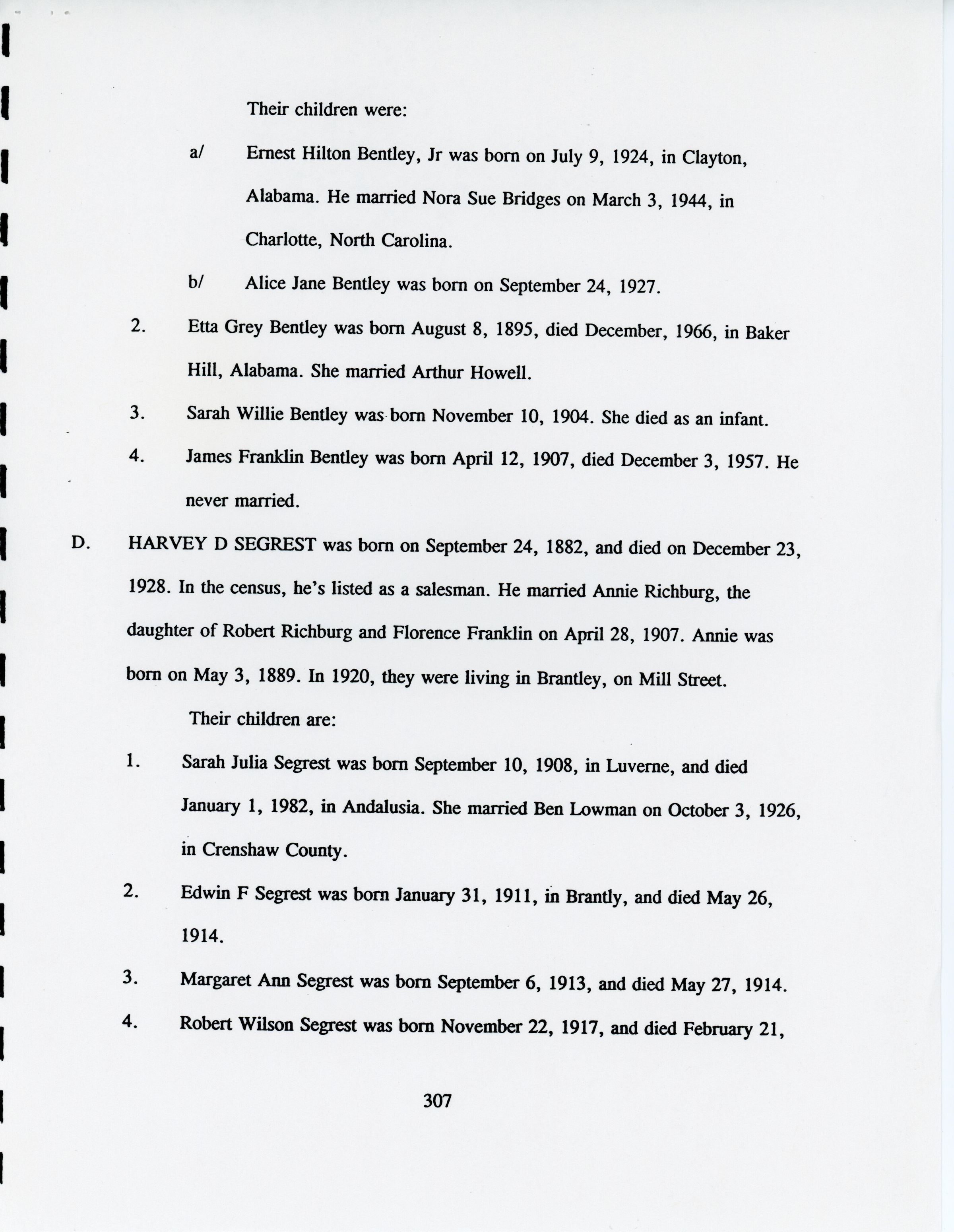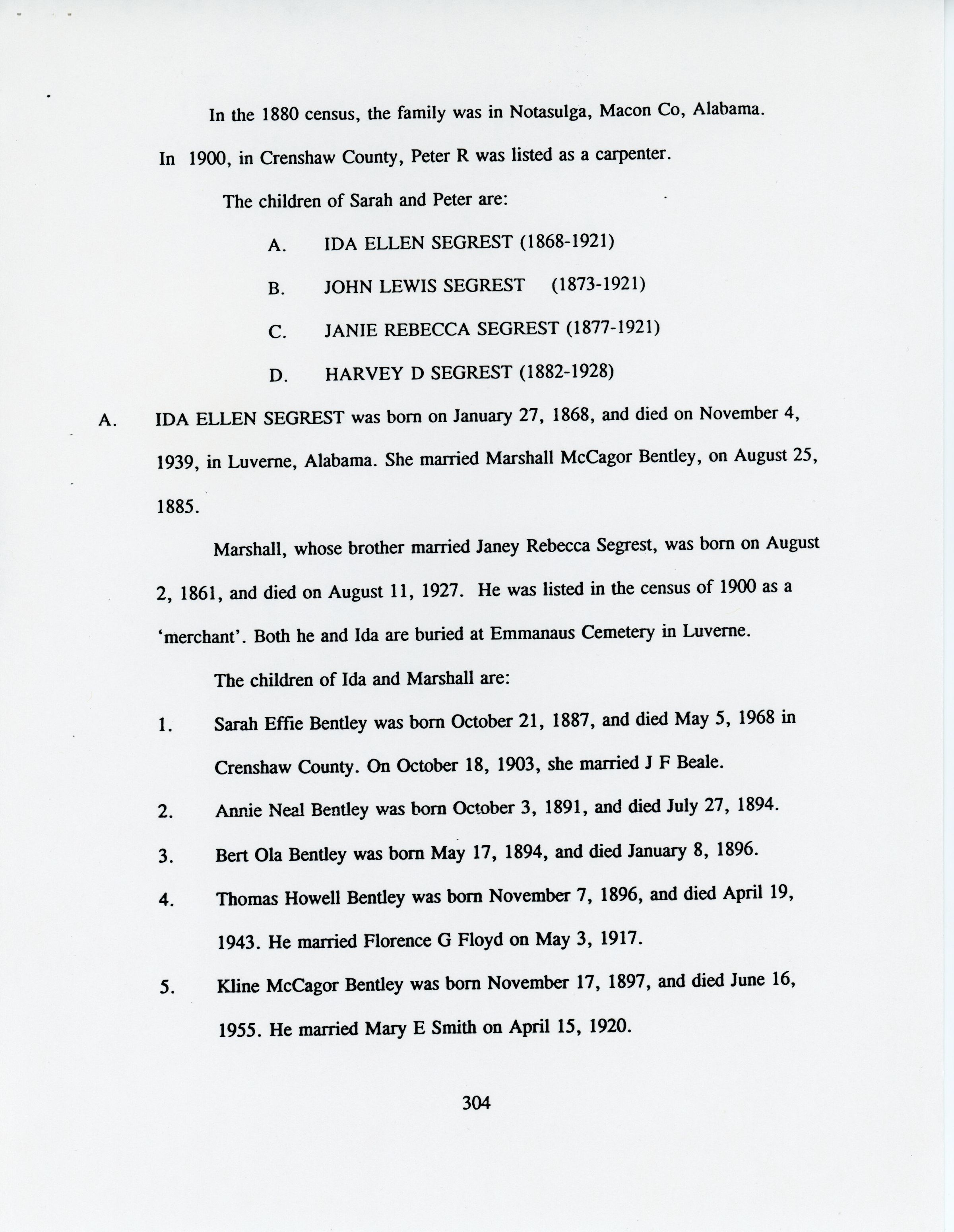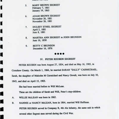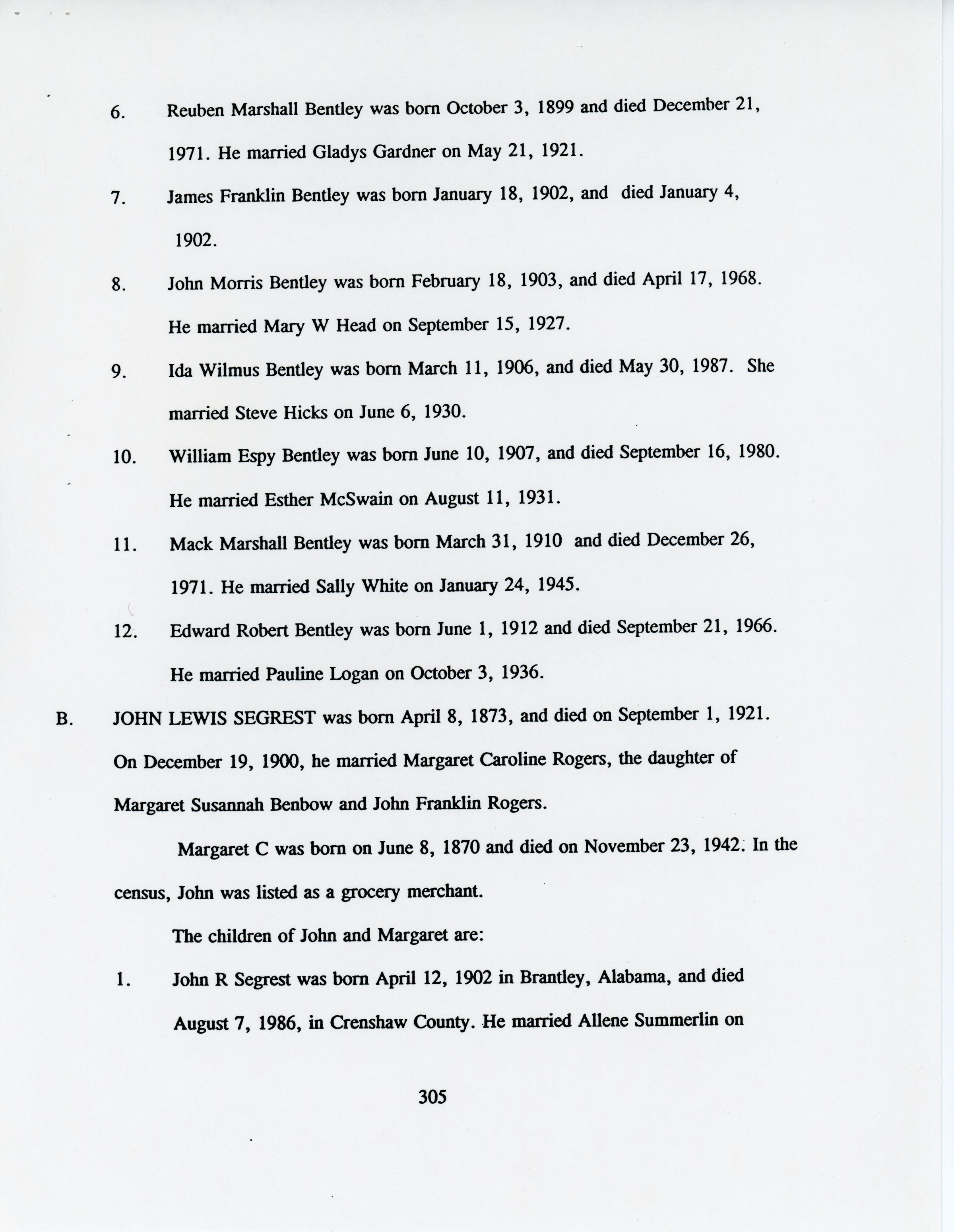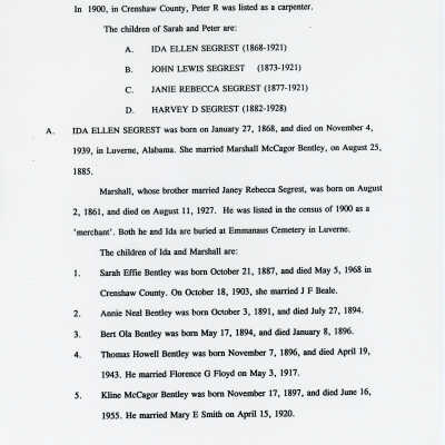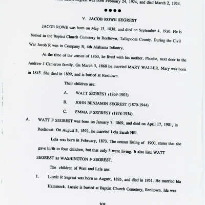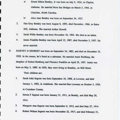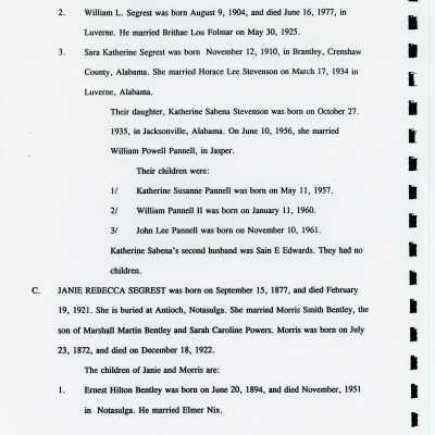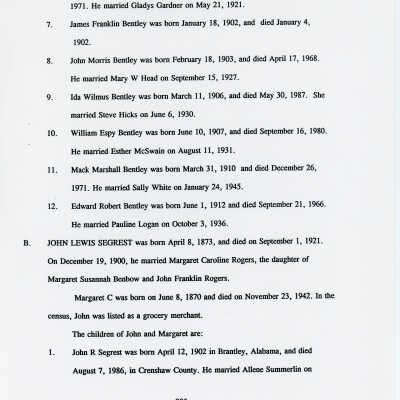 Freddie Hart Segrest, Phala Jordan Tatem, Henry Segrest, Margaret Segrest Argabright, Adam Brown Segrest, Dulsey Ethel Segrest, Martha Ann Segrest, John Brunson, Betty C. Brunson, Peter Reuben Segrest, John Lewis Segrest, John Franklin Rogers, Margaret Susannah Benbow, John Rogers Segrest Sr., Allene Summerlin, John Rogers Segrest Jr., Jacob Rowe Segrest, Mary Brown Segrest