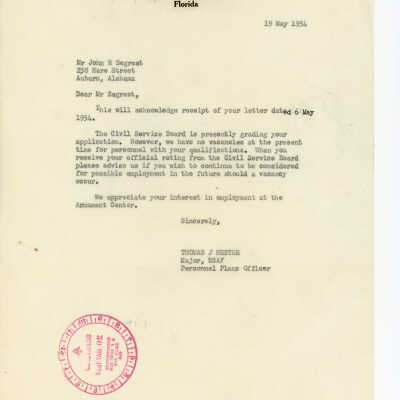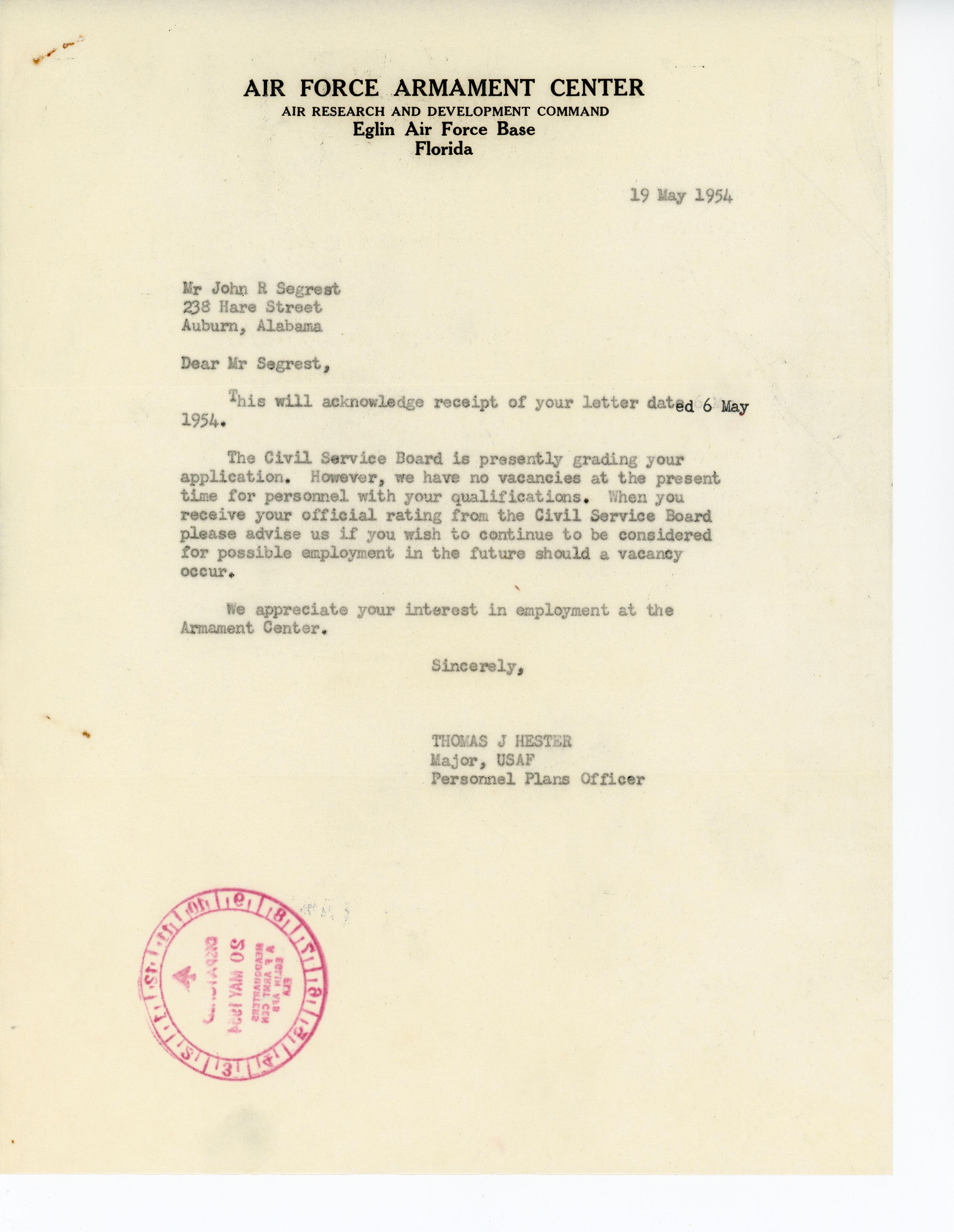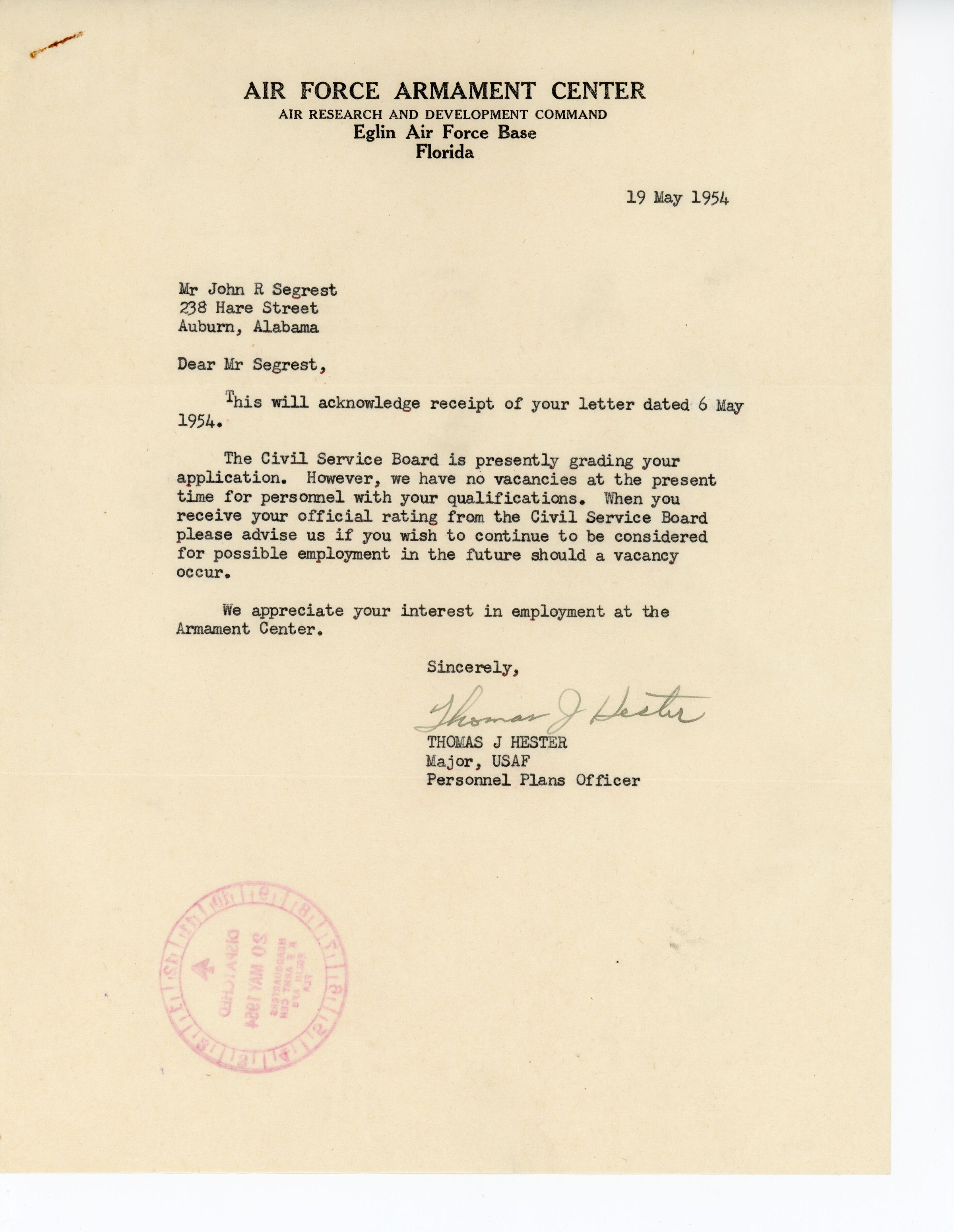 Letters between Air Force Armament Center and John Rogers Segrest, Jr.Entry/Object ID