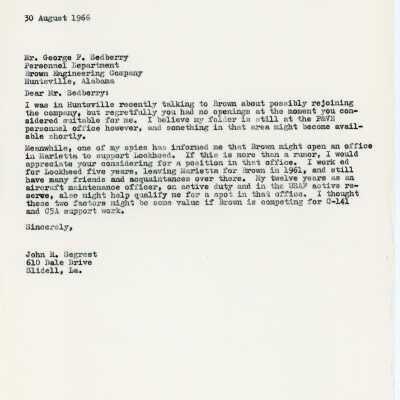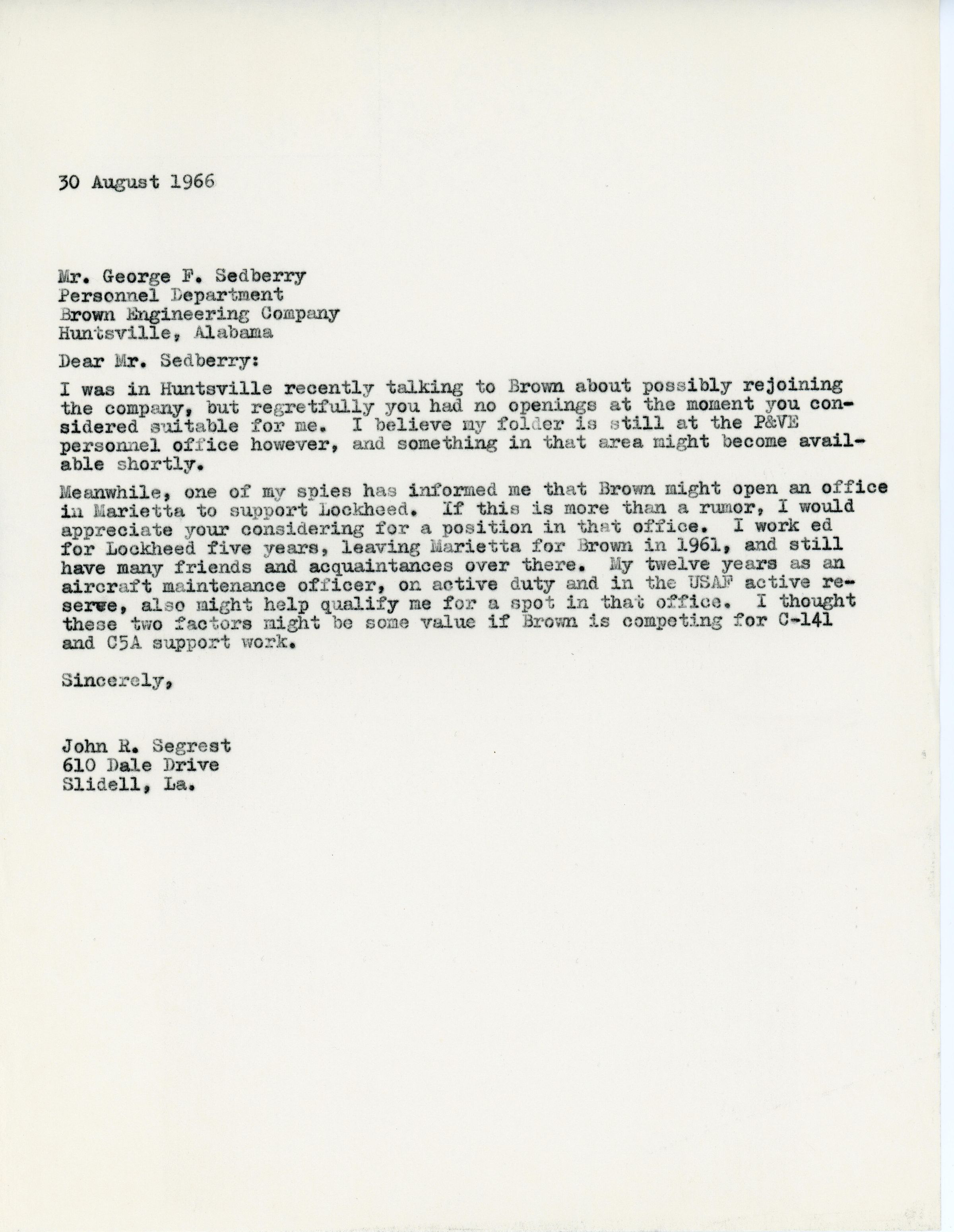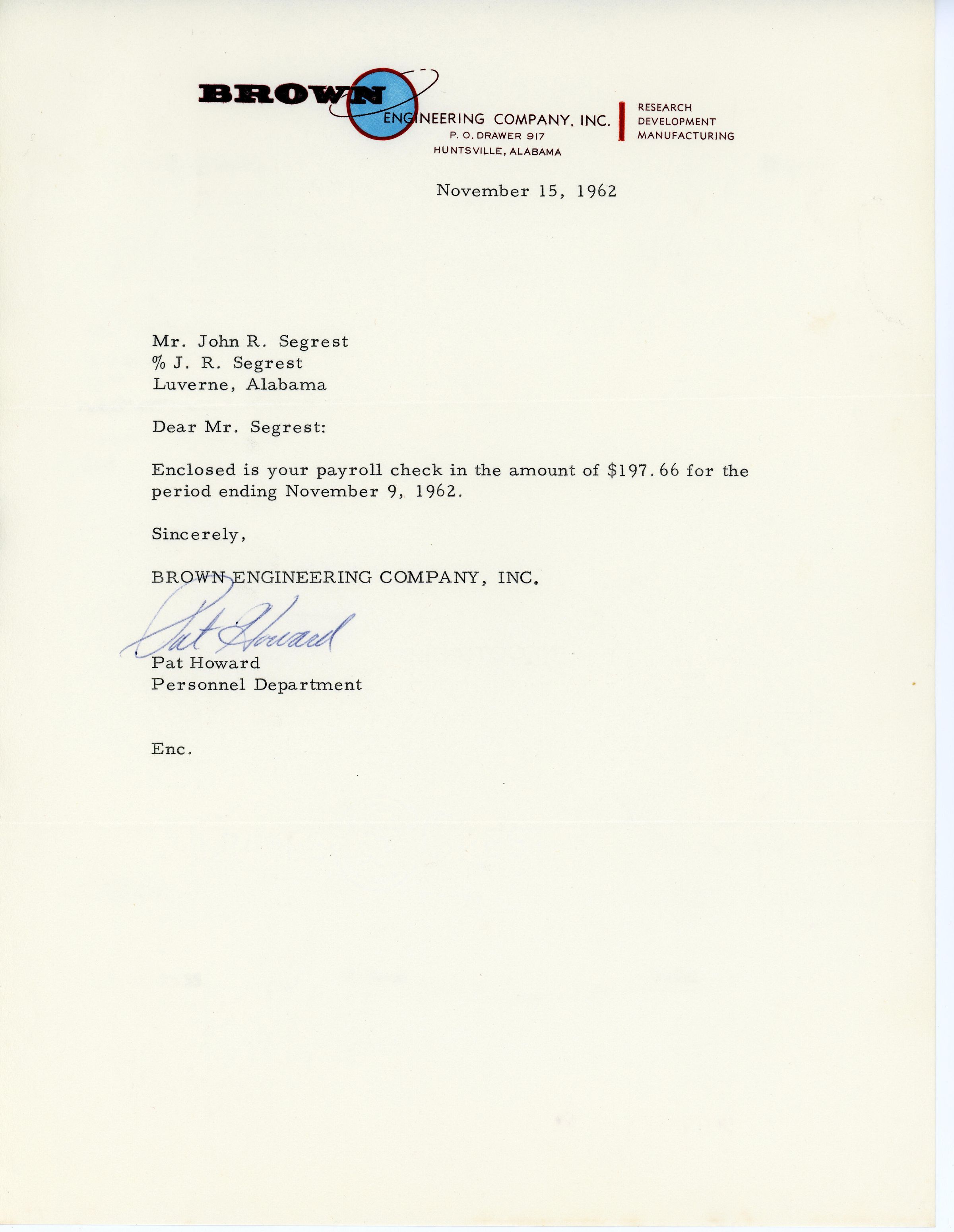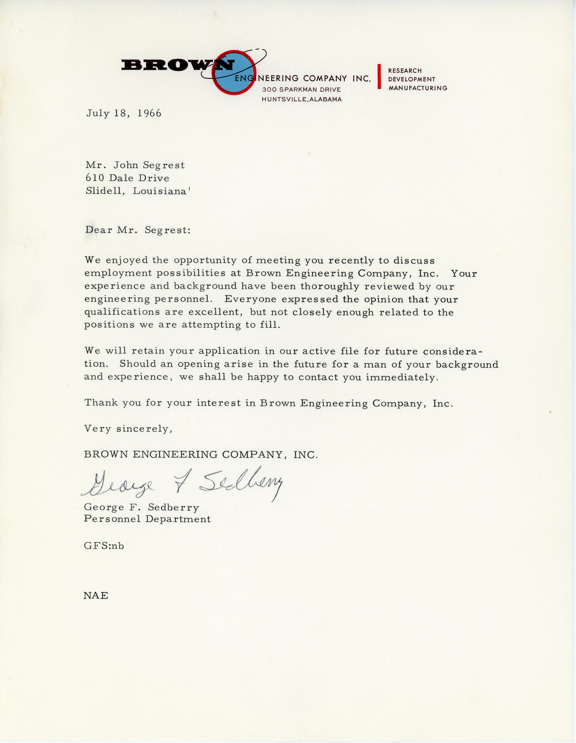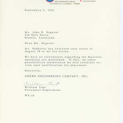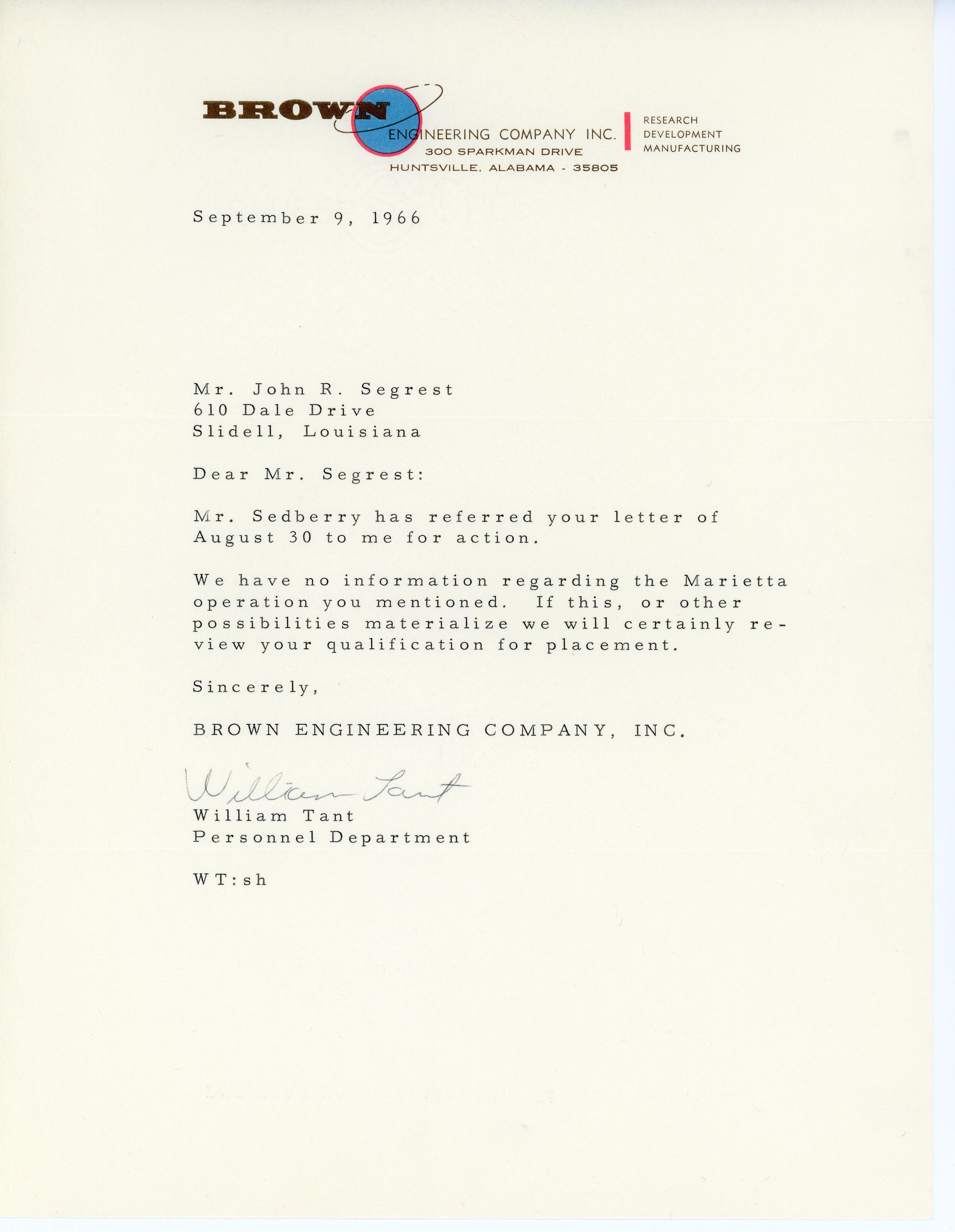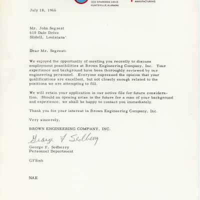 Letters between Brown Engineering and John Rogers Segrest, Jr.Entry/Object ID