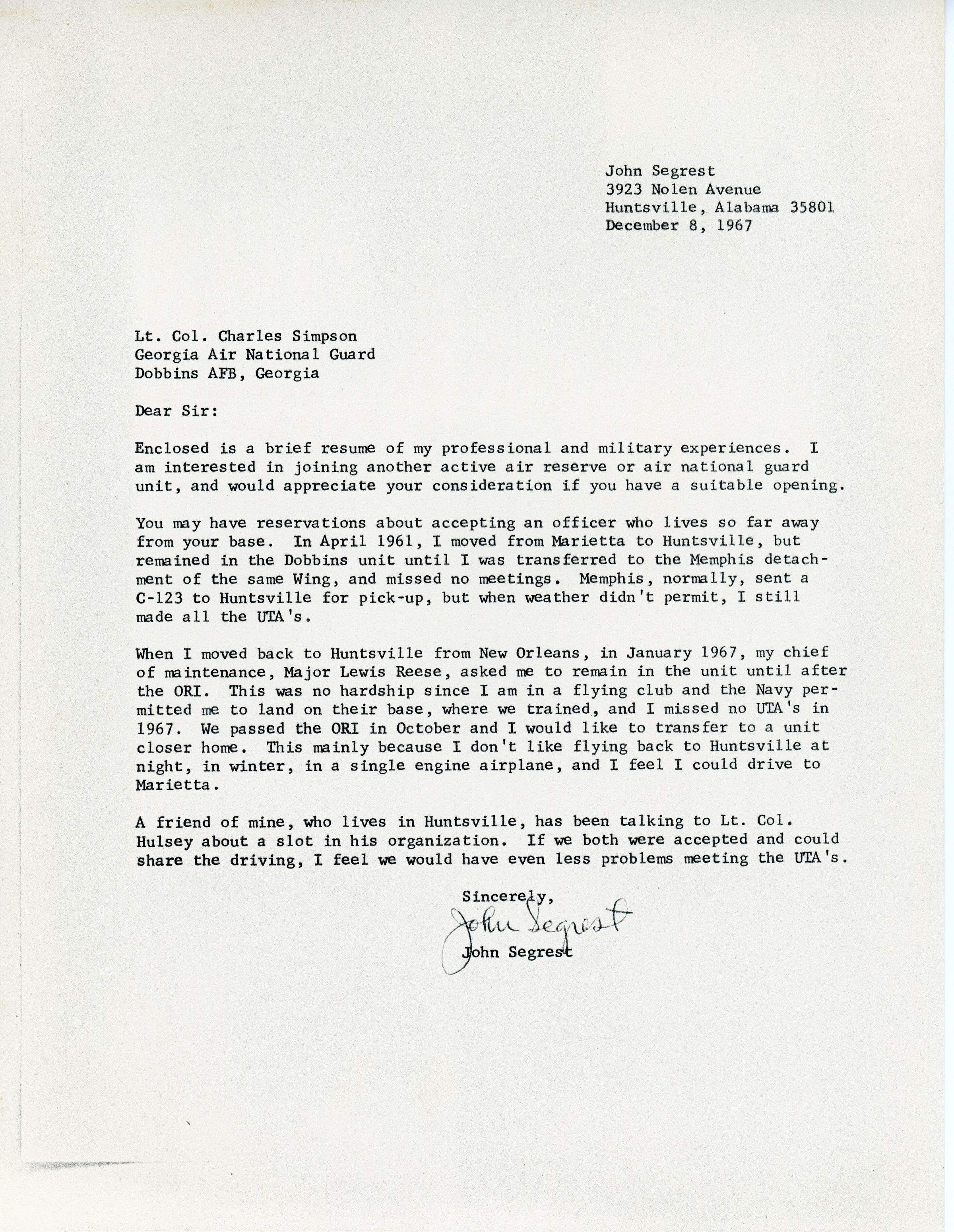 John Rogers Segrest, Jr.'s job application sent to the Georgia Air National GuardEntry/Object ID