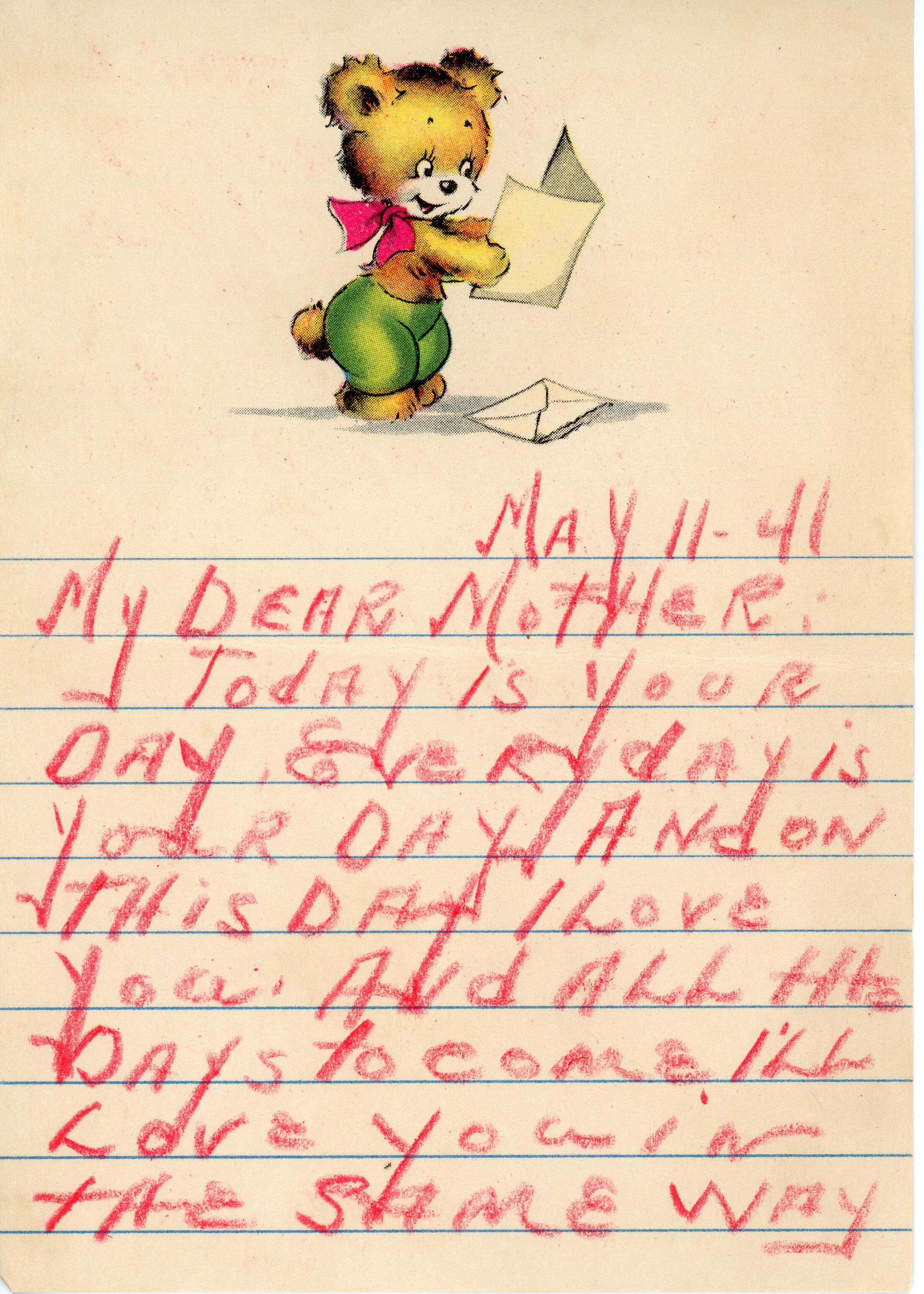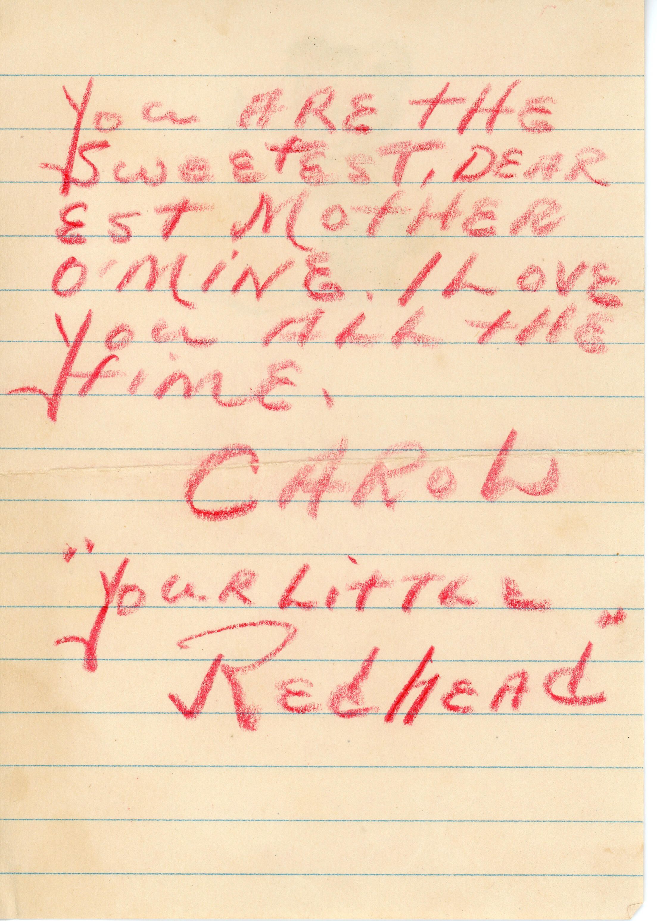 Letter addressed "My Dear Mother" from "Your Little Redhead"