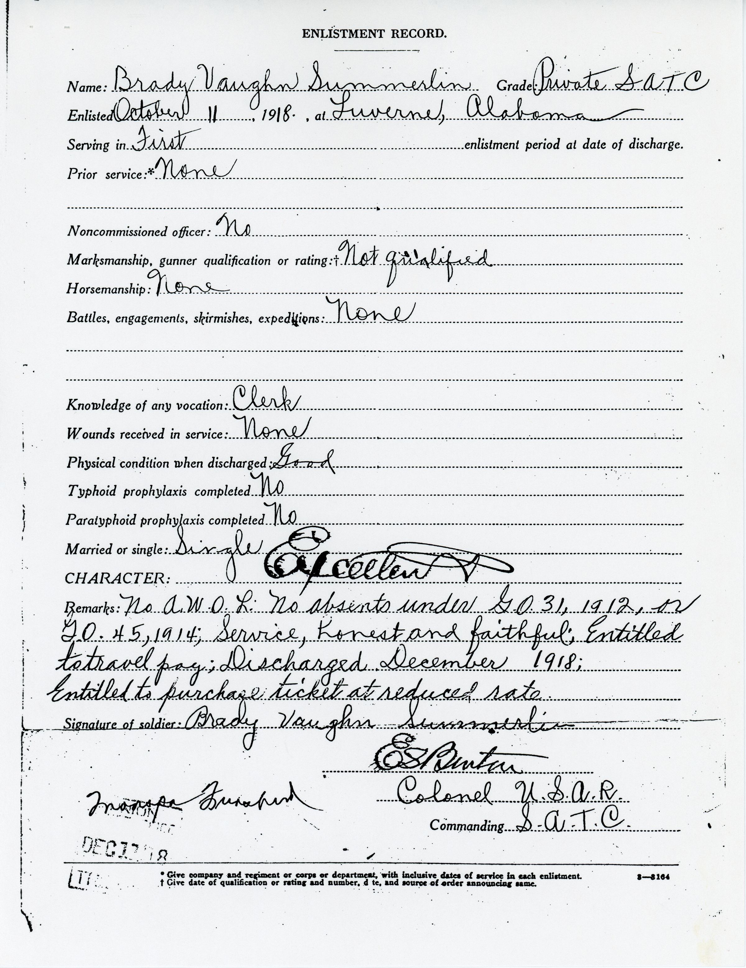 Brady Vaughn Summerlin's Enlistment RecordEntry/Object ID