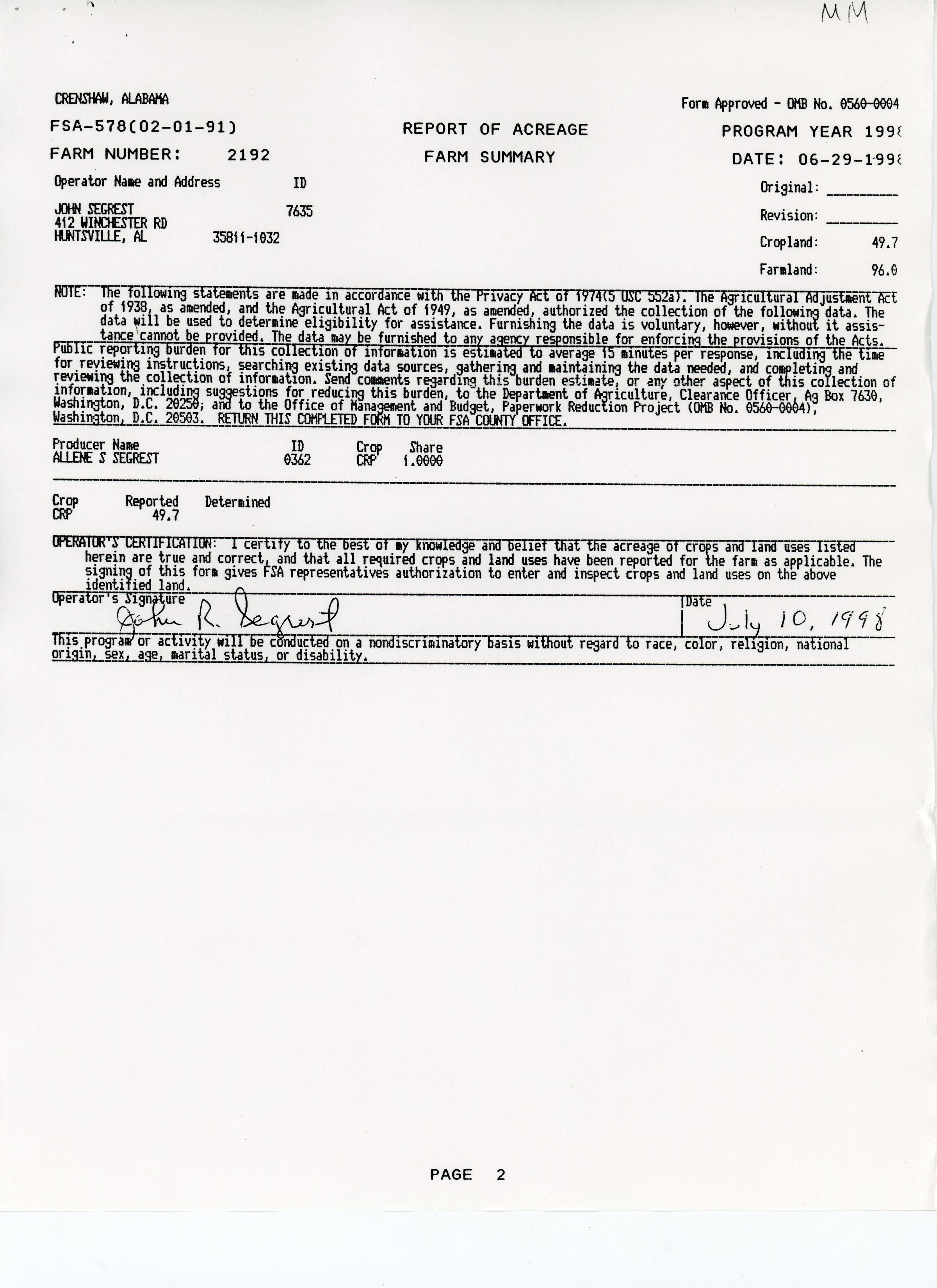 Report of Acreage