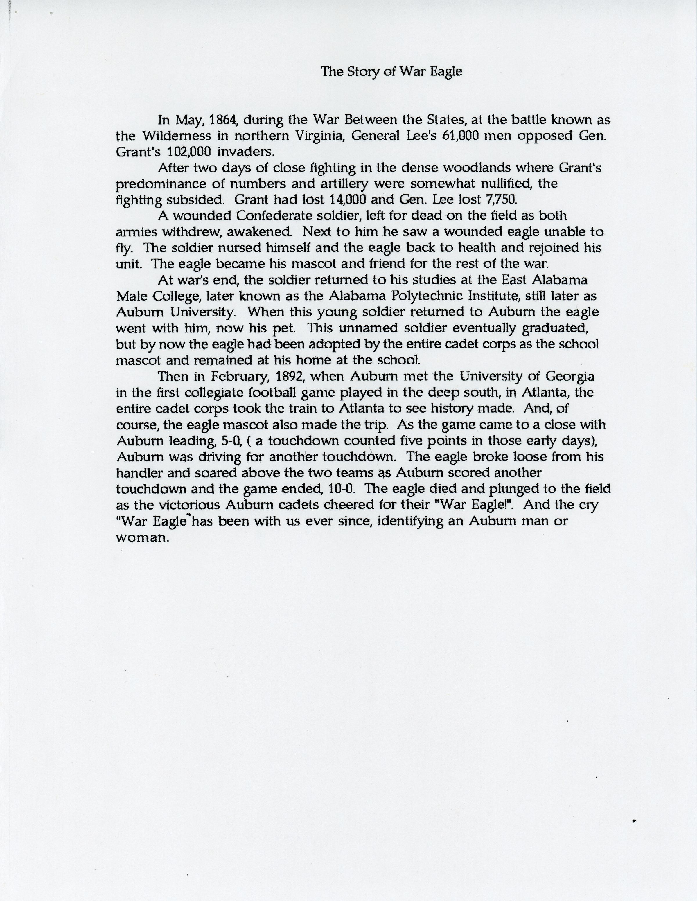 An account of the origins of Auburn University's War Eagle chant