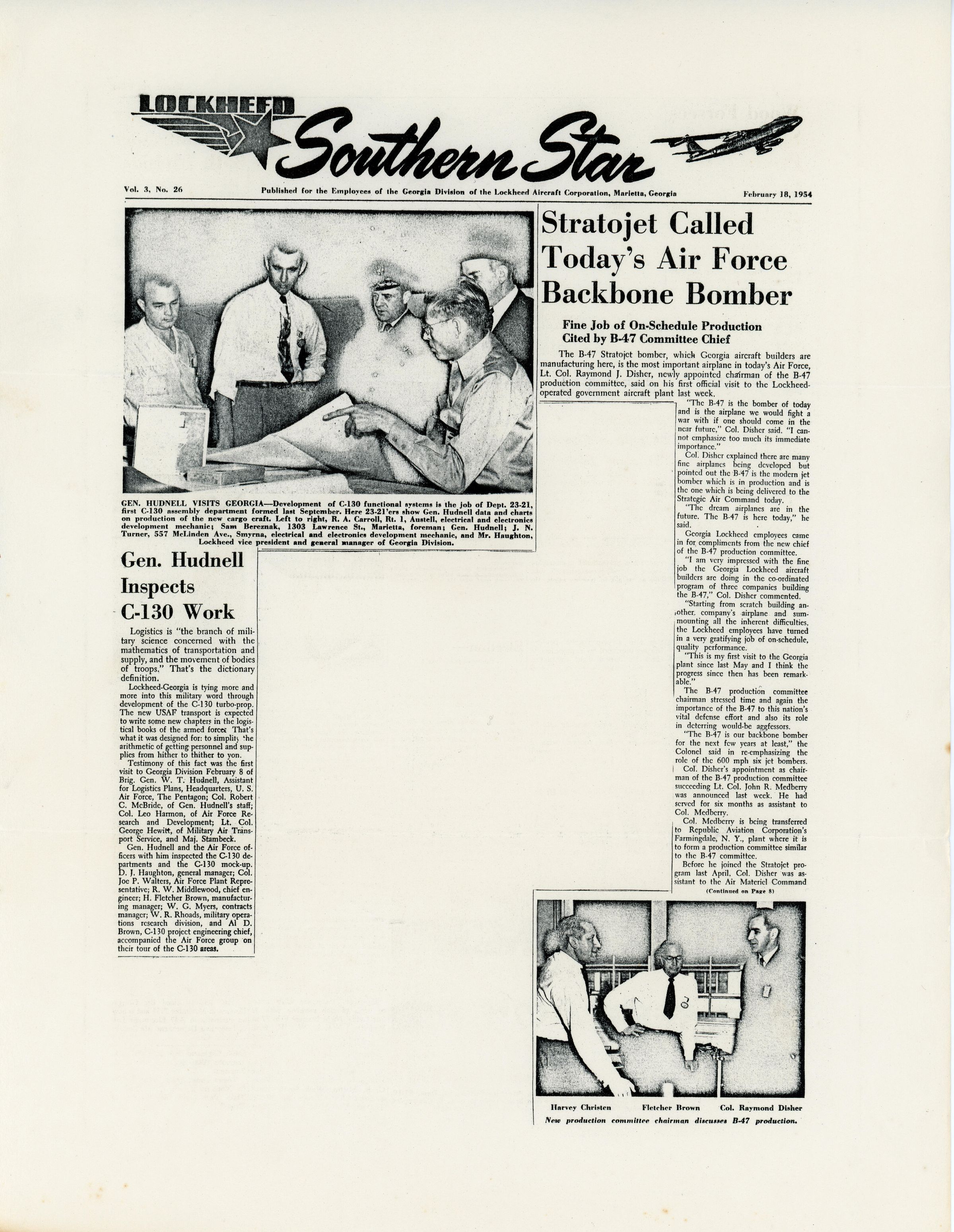 Cut out of page of Lockheed's Southern Star. Two articles are included titled "Gen Hudnell Inspects C-130 Work" and "Stratojet Called Today's Air Force Backbone Bomber"