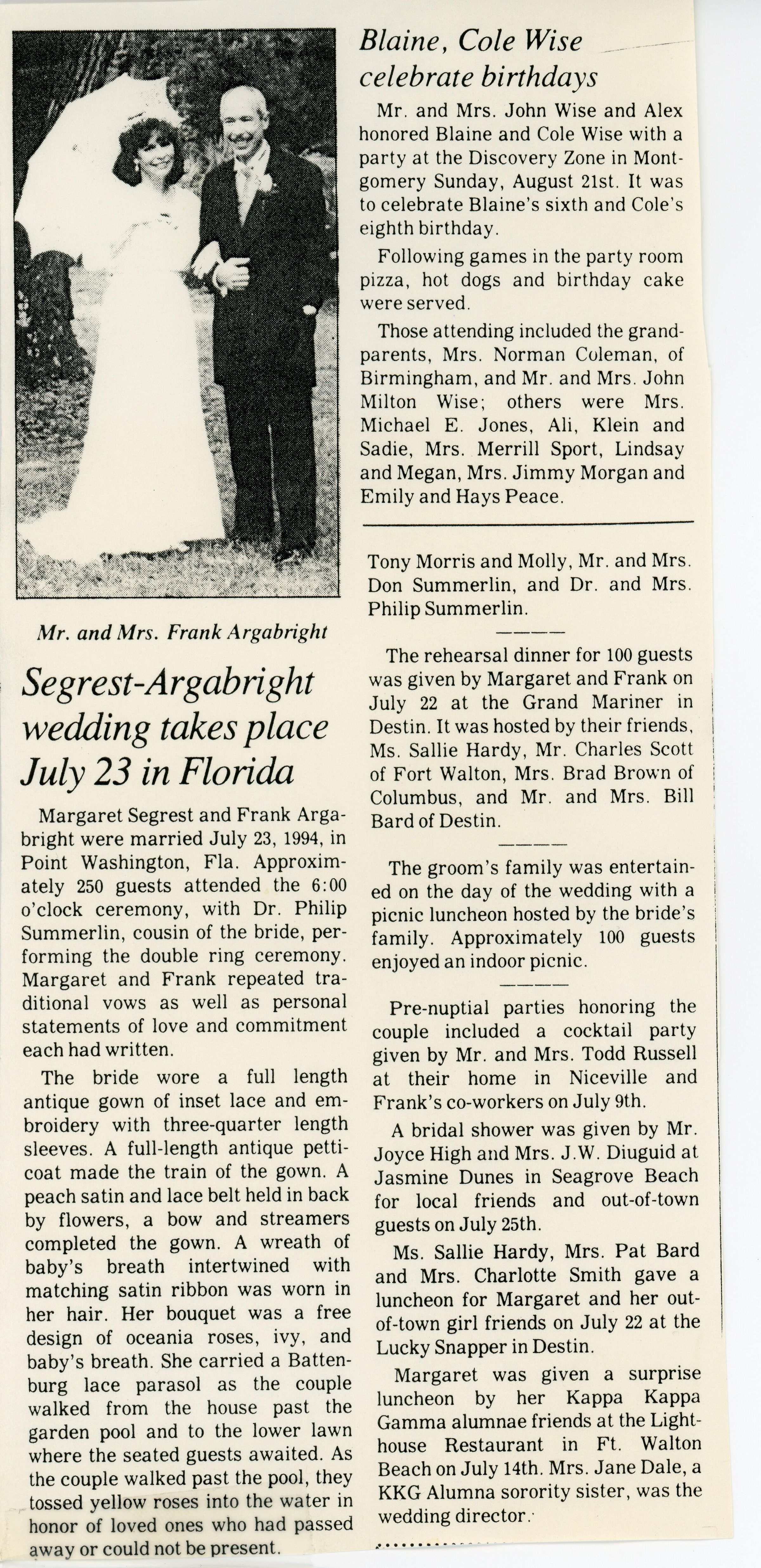 First portion of Segrest-Argabright wedding takes place July 23 in FloridaEntry/Object ID