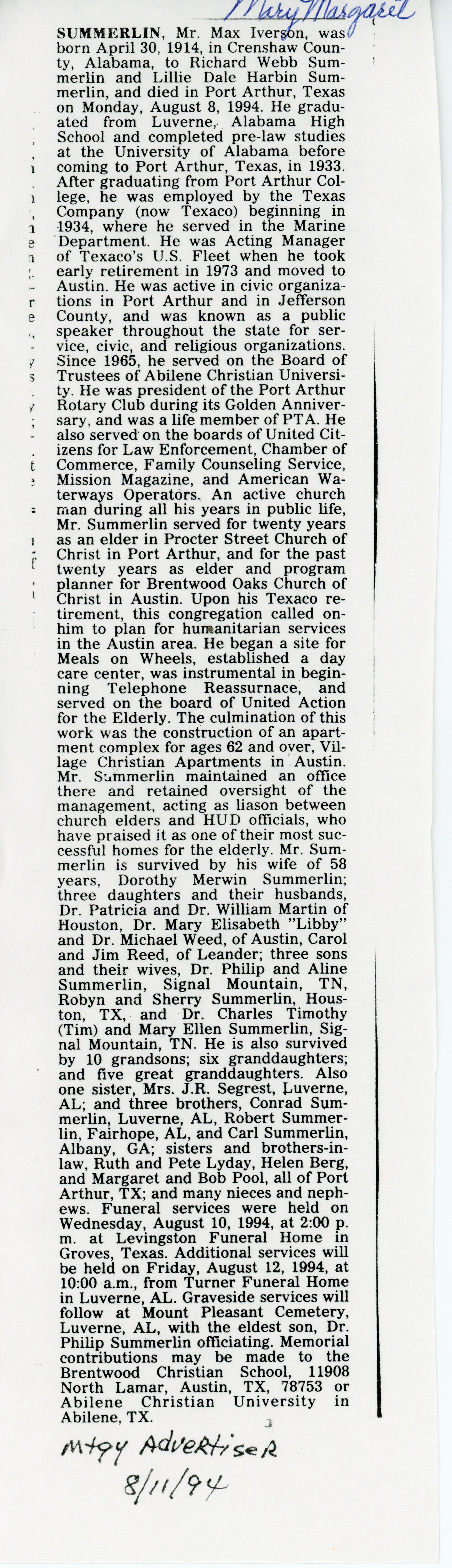 Max Iverson Summerlin, Richard Webb Summerlin, Lillie Dale Summerlin, Dorothy Merwin Summerlin, William Martin, Mary Elisabeth Weed, Michael Robbins Weed, Carol Reed, Jim Reed, Sherry Summerlin, Charles Timothy Summerlin, Mary Ellen Summerlin, Allene Summerlin, John Rogers Segrest Jr., Conrad Phillip Summerlin, Robert Lauris Summerlin, Carl Webster Summerlin, Ruth Lyday, Pete Lyday, Helen Berg, Margaret Pool, Bob Pool, Robyn Iverson Summerlin, Philip Harbin Summerlin, Catherine Aline Fuselier, Patricia Dale Summerlin