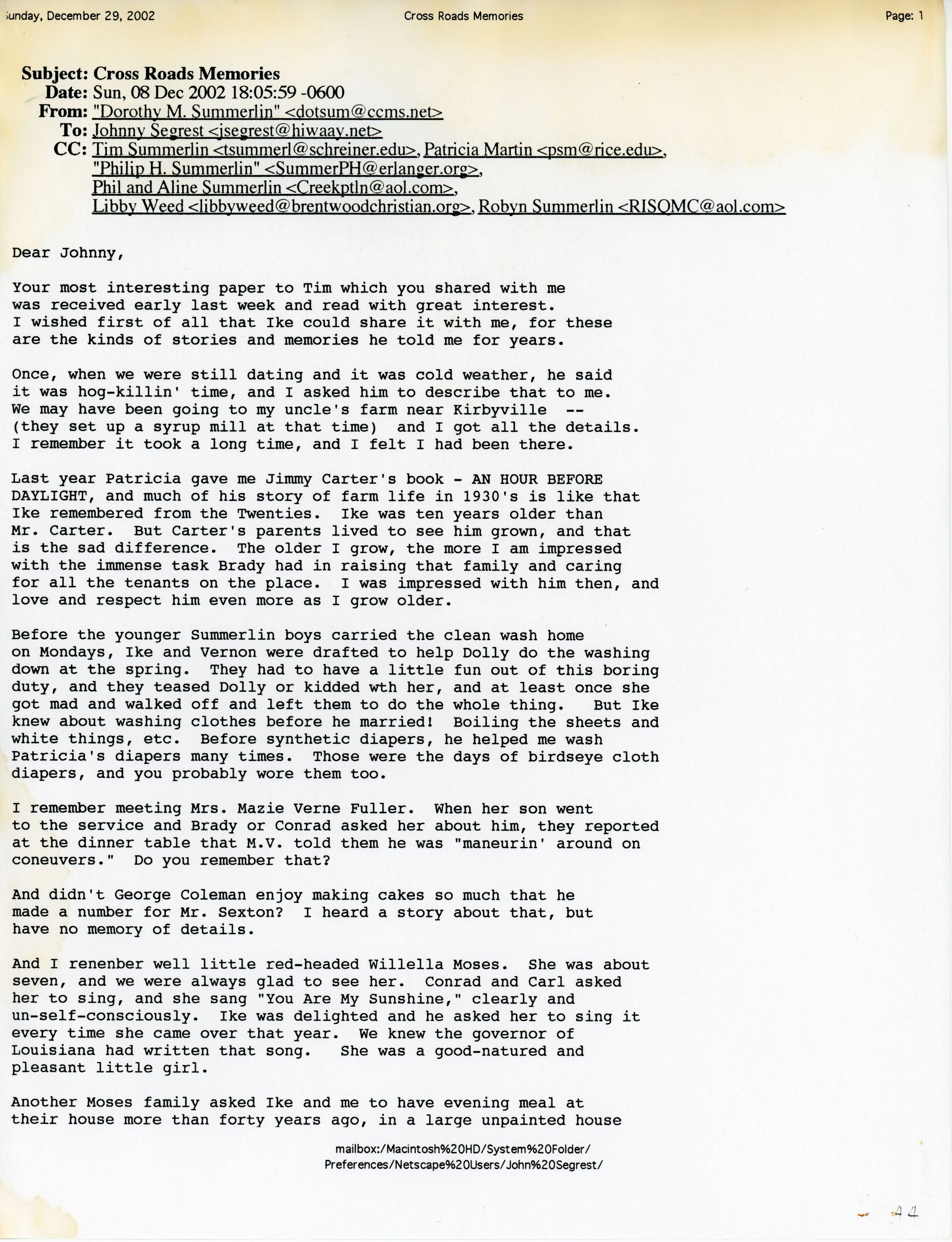 Dorothy Merwin Summerlin, John Rogers Segrest Jr., Tim Summerlin, Phil Summerlin, Libby Weed, Ike Summerlin, Brady Summerlin, Vernon Shelly Summerlin, Mazie Verne Fuller, George Coleman, Willella Moses, Conrad Phillip Summerlin, Carl Webster Summerlin, Mildred Moses, Gail Moses, Robyn Iverson Summerlin, Philip Harbin Summerlin, Catherine Aline Fuselier, Patricia Dale Summerlin