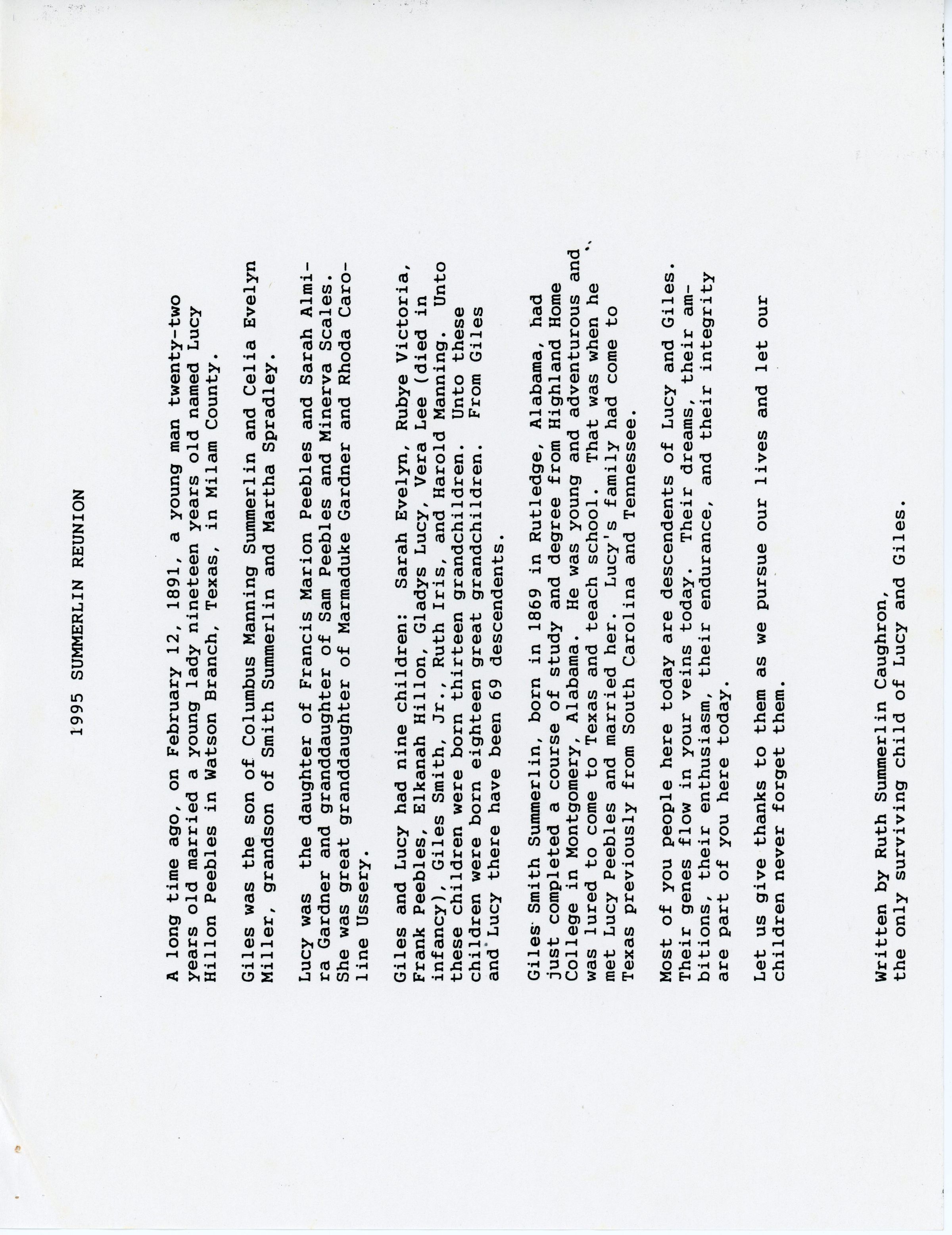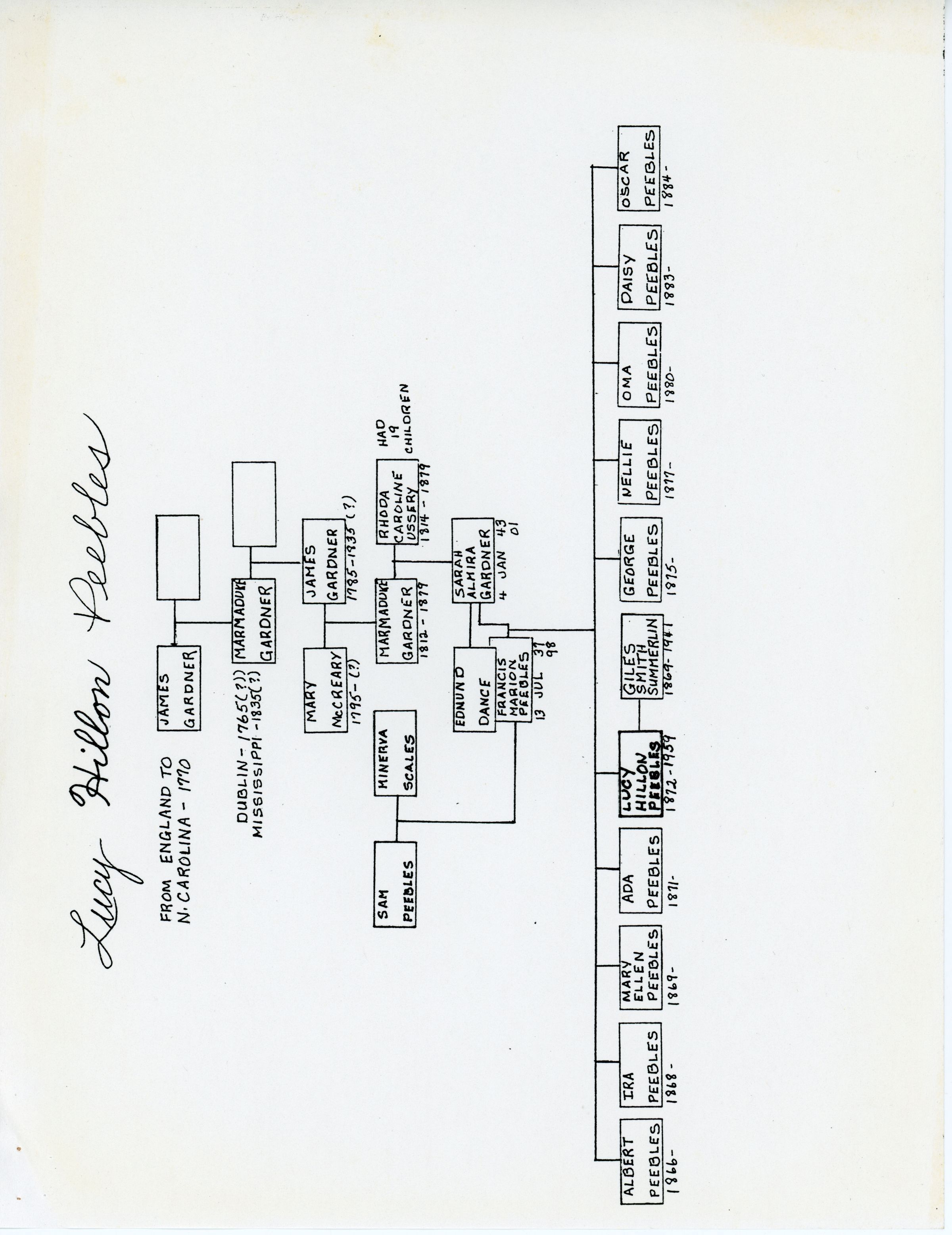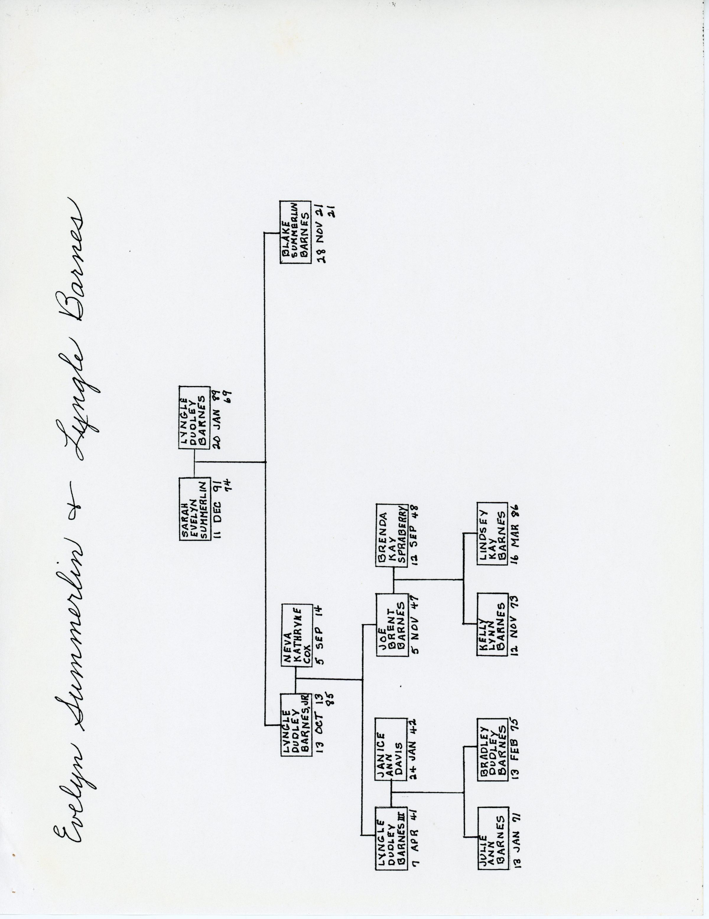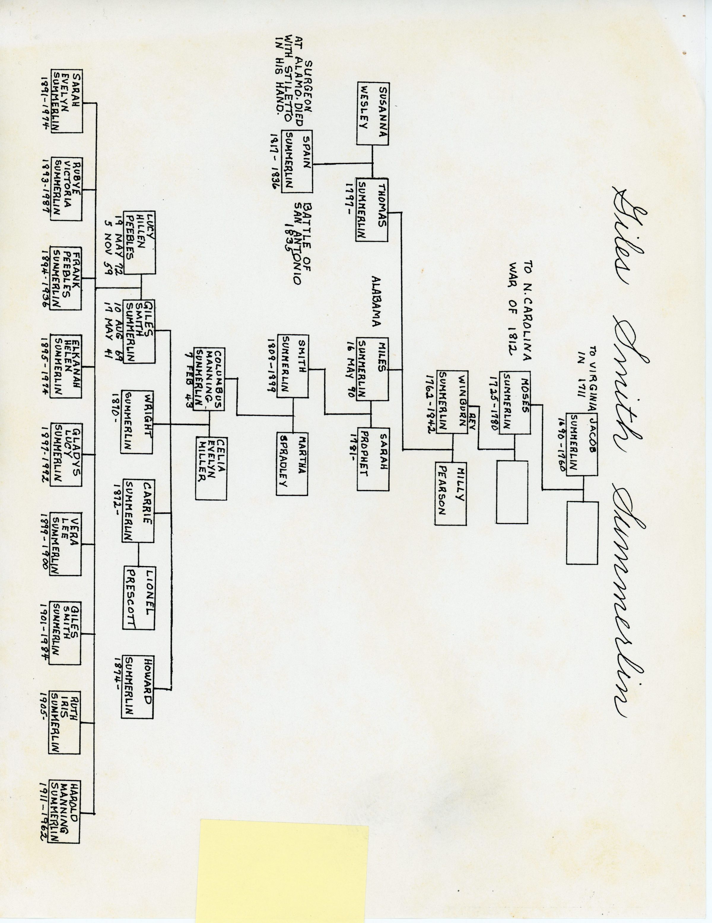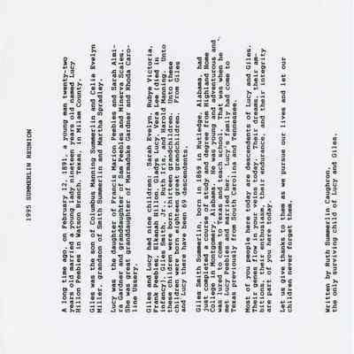 Giles Summerlin, Lucy Hillon Peebles, Columbus Summerlin, Celia Evelyn Miller, Smith Summerlin, Martha Summerlin, Francis Marion Peebles, Sarah Almira Gardner, Sam Peebles, Minerva Scales, Marmaduke Gardner, Rhoda Caroline Ussery, Sarah Evelyn Summerlin, Rubye Victoria Summerlin, Frank Peebles Summerlin, Elkanah Hillon Summerlin, Gladys Summerlin, Vera Lee Summerlin, Giles Smith Summerlin, Jr., Ruth Iris Summerlin, Harold Manning Summerlin, Jacob Summerlin, Moses Summerlin, Winburn Summerlin, Milly Summerlin, Susanna Wesley, Thomas Davis Summerlin, Miles Summerlin, Sarah Prophet, Spain Summerlin, Smith Summerlin, Martha Summerlin, Columbus Summerlin, Celia Evelyn Miller, Lucy Hillon Peebles, Giles Summerlin, Wright Summerlin, Carrie Summerlin Prescott, Lionel Prescott, Howard Summerlin, Sarah Evelyn Summerlin, Rubye Victoria Summerlin, Frank Peebles Summerlin, Elkanah Hillon Summerlin, Gladys Summerlin, Vera Lee Summerlin, Giles Smith Summerlin, Jr., Ruth Iris Summerlin, Harold Manning Summerlin, James Gardner, Marmaduke Gardner, Mary McCreary, Sam Peebles, Minerva Scales, Rhoda Caroline Ussery, Edmund Dance, Sarah Almira Gardner, Oscar Peebles, Daisy Peebles, Oma Peebles, Nellie Peebles, George Peebles, Ada Peebles, Mary Ellen Peebles, Ira Peebles, Albert Peebles, Lyngle Dudley Barnes, Lyngle Dudley Barnes Jr., Neva Kathryne Cox, Blake Summerlin Barnes, Lyngle Dudley Barnes III, Janice Ann Davis, Joe Brent Barnes, Brenda Kay Sprayberry, Julie Ann Barnes, Bradley Dudley Barnes, Kelly Lynn Barnes, Lindsey Kay Barnes, Hardin Hull Camp, Elwood Beane Christian, Thomas Masters, Lucy Dail Christian, Joseph M. Sahraie, Mae Pipkin, Lois Faye Wixson, Harvey Newell Summerlin, Jackie Lou Mills, Carol Ann Herring, Mary Kay Summerlin, Clifford Moriarty, Katlyn Courtney Summerlin, Harvey Newell Summerlin Jr., Kristi Lynn Hooker, Giles Franklin Summerlin, Cheryl Lynn Fenter, Harvey Newell Summerlin III, Sadie Marie Summerlin, Ainsley Lanae Summerlin, Keeton Manning Summerlin, Walter Eugene Caughron, Walter Eugene Caughron Jr., Ethel Thomas, Frank Peebles Summerlin Jr., Bertha Jo Williams, Jerrold Lyndell Summerlin, Dorothy Cangelose, Frankie Dee Summerlin, Jerrold James Summerlin, Frank Lyndell Summerlin, Linda Schlegel, Justin Michael Summerlin, Jacqueline Marie Summerlin, Gladys Lucy Summerlin, Phyllis Sue Shepherd, Ruth Lynn Caughron, John Marcellus Gaulding, Charles Richard Phillips, Clyde Clifton McWhorter, Douglas Eugene Caughron, Linda Lou Chappell, Cathy Michell Caughron, Timothy Robert Kish, Deborah Dee Caughron, Philip Richard Ducloux, Vicky Lynn Gaulding, Daryl Edward Redinger, Robert Linn Lindsey, James Mark Gaulding, Phlisa Gay Gaulding, Deborah Lynn Trujillo, Stephen Chappell Caughron, Cody Douglas Caughron, Tiffany Louise Caughron, Lauren Marie Kish, Cameron Douglas Kish, Daniel Xavier Ducloux, Dominique Noelle Ducloux, Adrienne Lea Redinger, Amanda Gail Redinger, Megan Lynn Gaulding, Laura Lacy Gaulding, Harold Manning Summerlin, Allyne Miertchin, Mary Lou Belonger, Giles Kelton Summerlin, Evelyn Marie Dana, Brett Jason Summerlin, Charlotte Beth Summerlin, Melinda Marie Summerlin, William Homer Kelton Spillar, Giles Dennett Spillar, Mary Lou Sloan, Kelton Homer Spillar, Oleta Rose Weatherford, Rubye Hope Spillar, David Melville McCullough, George Kelton McCullough, Pamela Hughes, Ronald Dennett Spillar, Thomas Ray Spillar, Nelta Jeanette Pursley, Linda Diane Berry, David Giles McCullough, Deborah Ann Hanley, Heidi Lorraine McCullough, Nicole Hope McCullough, Christie Ann McCullough, Candace Joy McCullough, Ashley Jane McCullough