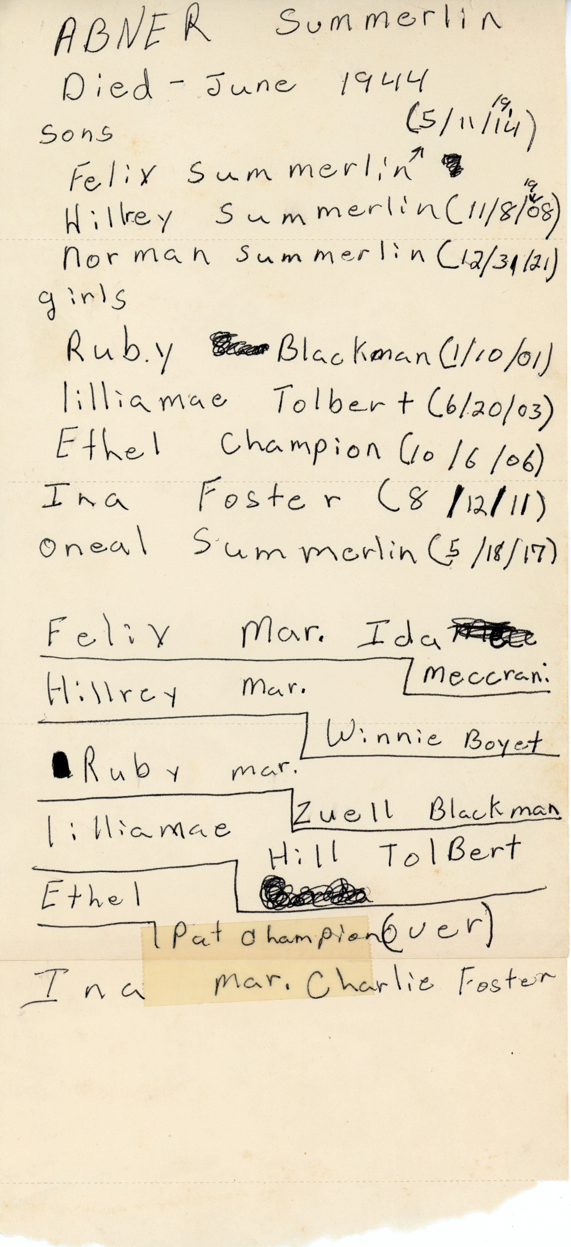 Abner Summerlin, Felix Summerlin, Hillrey Summerlin, Norman Summerlin, Ruby Summerlin Blackman, Lilliamae Summerlin Tolbert, Ethel Summerlin Champion, Ina Summerlin Foster, Oneal Summerlin, Ida Meccrani Summerlin, Winnie Boyet Summerlin, Zuell Blackman, Pat Champion, Charlie Foster