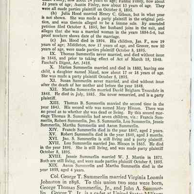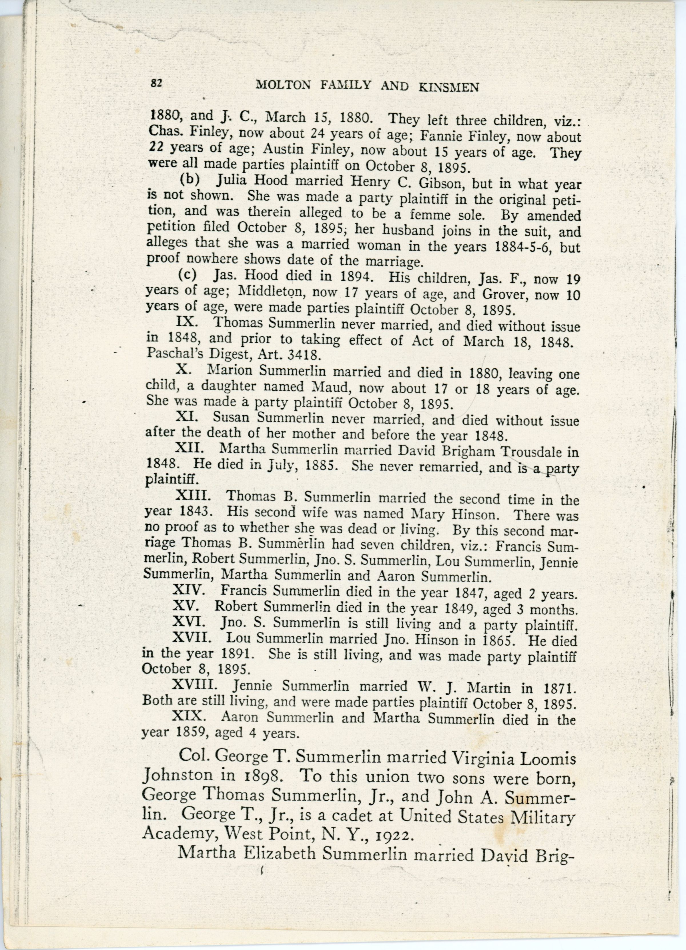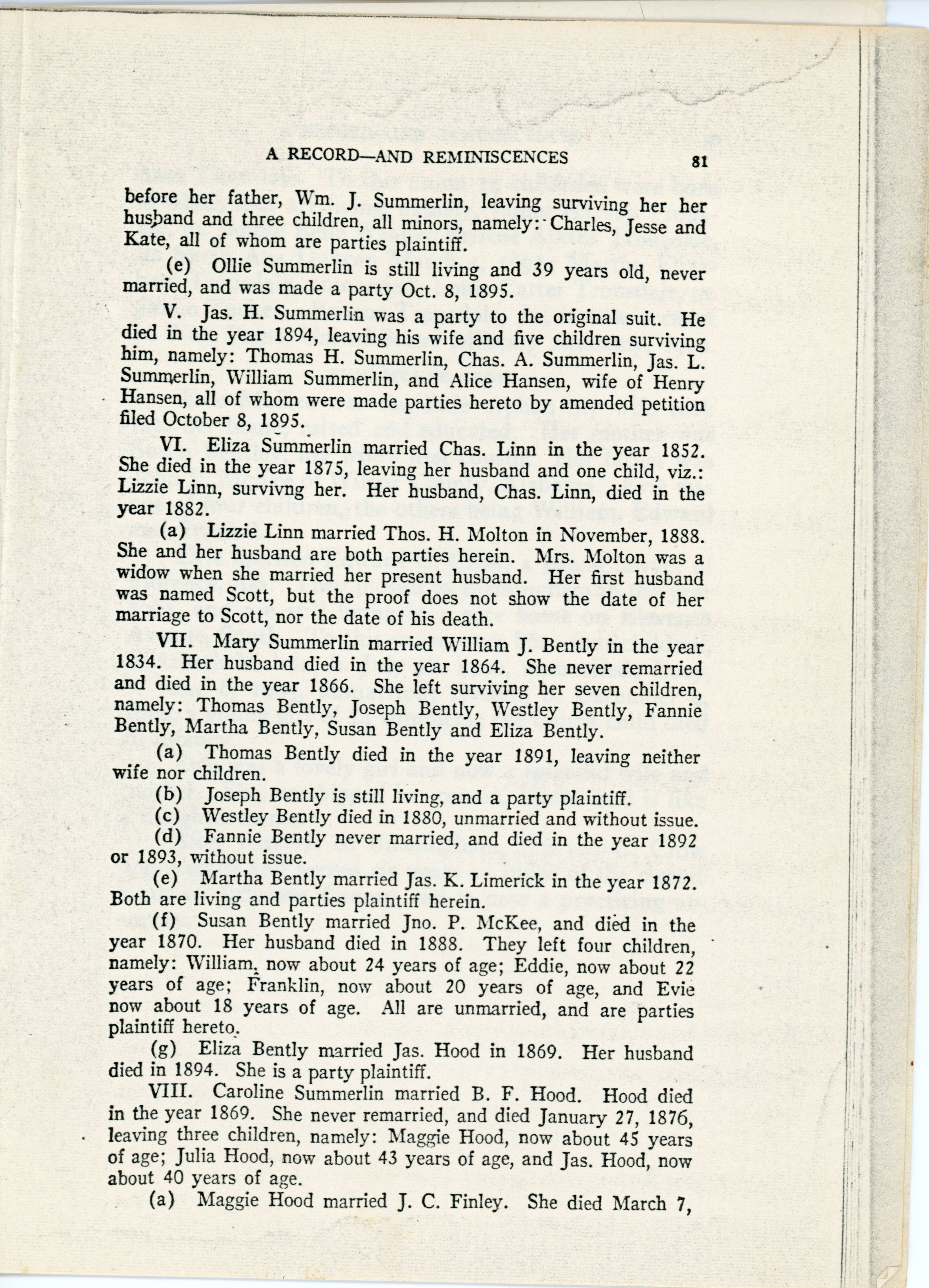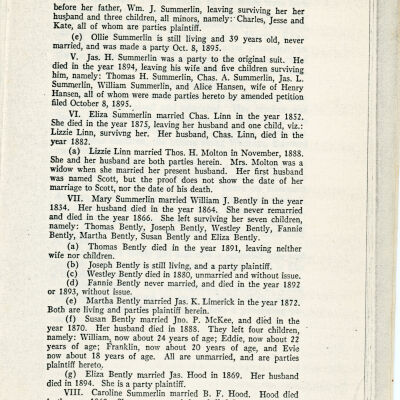Eliza Jane Summerlin, Thomas B. Summerlin, Spain Summerlin, Susanna Summerlin, William Summerlin, Mary Summerlin, Caroline Summerlin, Marion Summerlin, Martha Summerlin, Margaret Summerlin, F. O. Summerlin, Josephine Summerlin, Ollie Summerlin, William J. Davis, William P. Fitch, Charles Fitch, Jesse Fitch, Kate Fitch, Alice Hansen, Henry Hansen, Lizzie Linn, Thomas H. Molton, William J. Bently, Thomas Bently, Joseph Bently, Westley Bently, Fannie Bently, Martha Bently, Susan Bently, Eliza Bently, William McKee, Eddie McKee, Franklin McKee, Evie McKee, B. F. Hood, Maggie Hood, Julia Hood, J. C. Finley, Charles Finley, Fannie Finley, Austin Finley, Henry C. Gibson, James Hood, Middleton Hood, James F. Hood, Grover Hood, Maud Summerlin, David Brigham Trousdale, Mary Hinson, Francis Summerlin, Robert Summerlin, John S. Summerlin, Lou Summerlin, Jennie Summerlin, Martha Summerlin, Aaron Summerlin, John Hinson, W. J. Martin, George Thomas Summerlin, Virginia Loomis Johnston, George Thomas Summerlin Jr., John A. Summerlin, James Harvey Trousdale, Jennie Belle Weaks, Briscoe Atkins Trousdale, Sarah Ava Duncan, Martha Elizabeth Trousdale, Louis Carter Trousdale, Jamie Tucker, Briscoe Trousdale Jr., James Hood, John P. McKee, James K. Limerick, Thomas H. Molton, Charles Linn, Charles A. Summerlin, James H. Summerlin, James T. Summerlin, James H. Summerlin