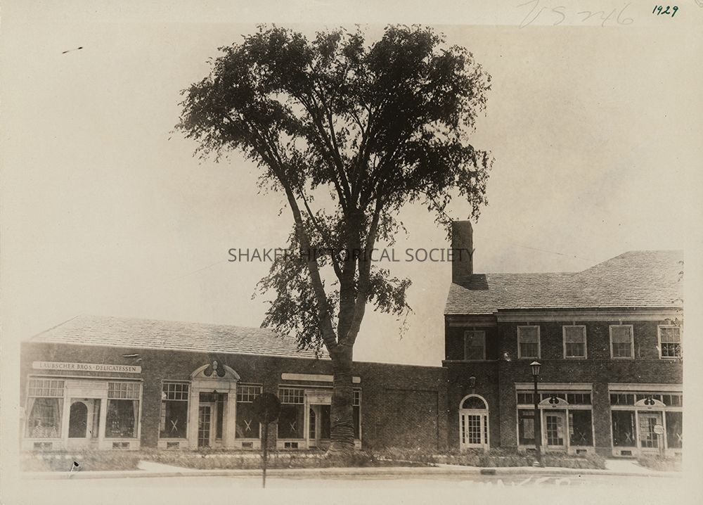 Black-and-white photograph dated 1929 of a large tree, possibly an elm, at the southwest quadrant of Shaker Square. Laubscher Brothers Delicatessen, located at 13130 Shaker Square at the time, is visible on the far left.Photograph Details