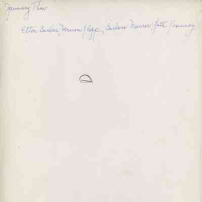 Black-and-white theatrical publicity photograph showing five Shaker Players cast members in "January Thaw": Elton Barber, an unidentified woman, Vernon Klopp, Barbara Maurer, and Ruth Kennedy. Identifying information written on verso.Photograph Details