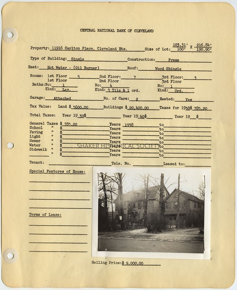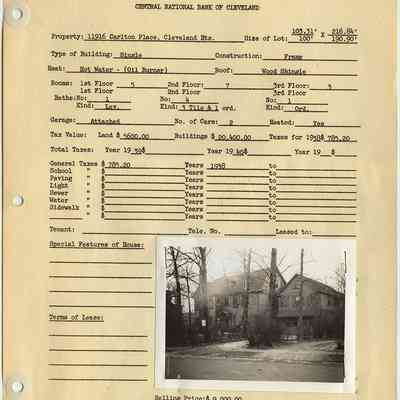 Appraisal form for 11916 Carlton Place in Cleveland Heights prepared by Central National Bank of Cleveland. Property data reflects construction and 1938 tax records with a photograph of the property taken in 1940.Collection