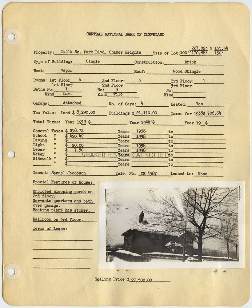 Appraisal form for 14414 South Park Boulevard in Shaker Heights prepared by Central National Bank of Cleveland. Property data reflects construction and 1938 tax records with a photograph of the property taken in 1940. Samuel Jacobson is listed as the tenant. Special features of the house included an enclosed sleeping porch on the second floor, servants quarters and bath over the garage, heating plant with stoker, and a ballroom on the third floor.Collection