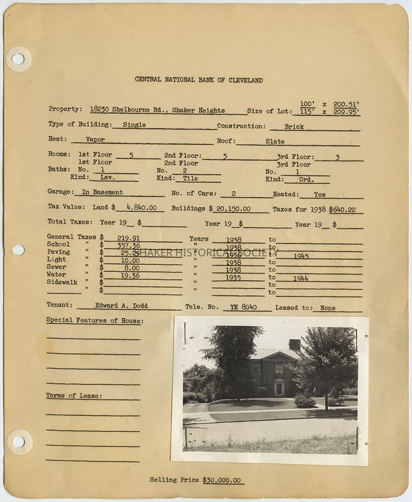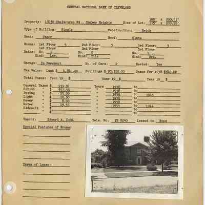 Appraisal form for 18230 Shelbourne [Shelburne] Road in Shaker Heights prepared by Central National Bank of Cleveland. Property data reflects construction and 1938 tax records with a photograph of the property taken in 1940. Edward A. Dodd is listed as the tenant.Collection