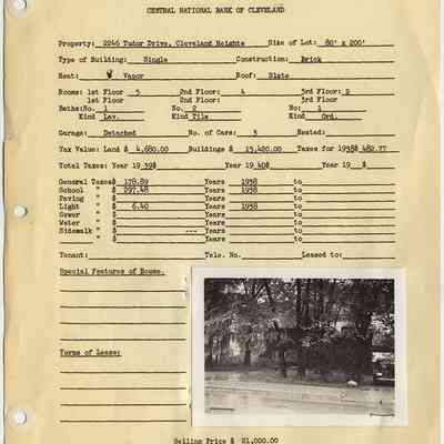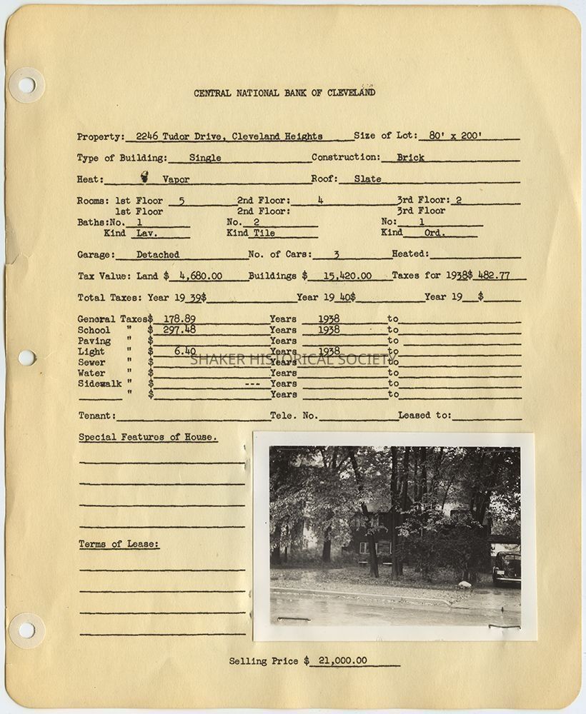 Appraisal form for 2246 Tudor Road in Cleveland Heights prepared by Central National Bank of Cleveland. Property data reflects construction and 1938 tax records with a photograph of the property taken in 1940.Collection