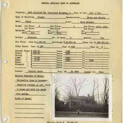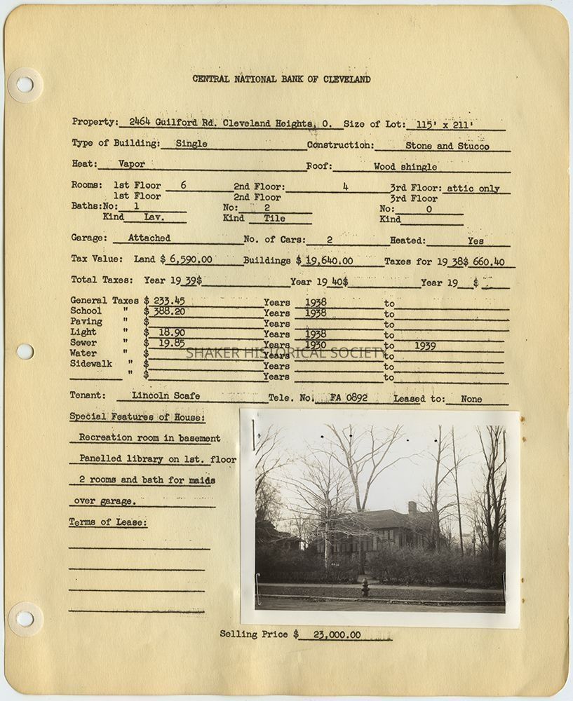 Appraisal form for 2464 Guilford Road in Cleveland Heights prepared by Central National Bank of Cleveland. Property data reflects construction and 1938 tax records with a photograph of the property taken in 1940. Lincoln Scafe is listed as the tenant. Special features of the house included a recreation room in the basement, a paneled library on the first floor, and two rooms and bath for maids over the garage.Collection