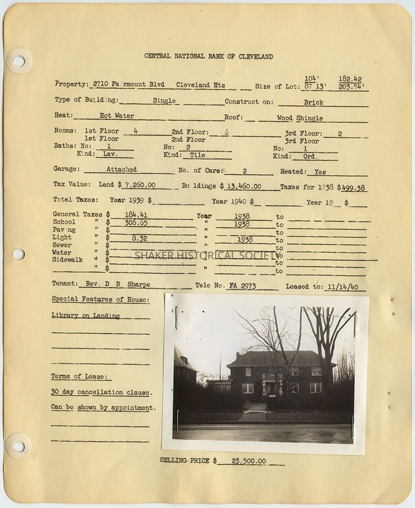 Appraisal form for 2710 Fairmount Boulevard in Cleveland Heights prepared by Central National Bank of Cleveland. Property data reflects construction and 1938 tax records with a photograph of the property taken in 1940. Reverend D. R. Sharpe is listed as the tenant. Special features of the house included a library on the landing.Collection