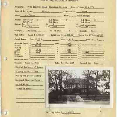Appraisal form for 2729 Edgehill Road in Cleveland Heights prepared by Central National Bank of Cleveland. Property data reflects construction and 1938 tax records with a photograph of the property taken in 1940. Roger L. Rice is listed as the tenant. Special features of the house included a library on the first floor, a den on the second floor landing, and an enclosed sleeping porch on the second floor.Collection