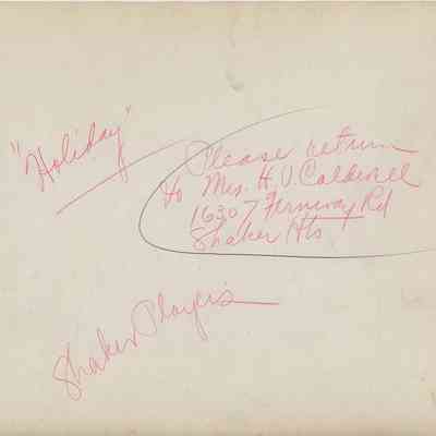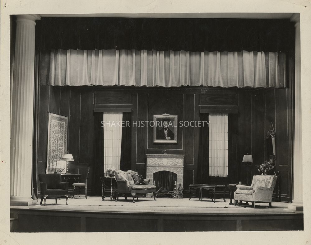Black-and-white theatrical publicity photograph showing Shaker Players set of "Holiday." Identifying information written on verso.Photograph Details