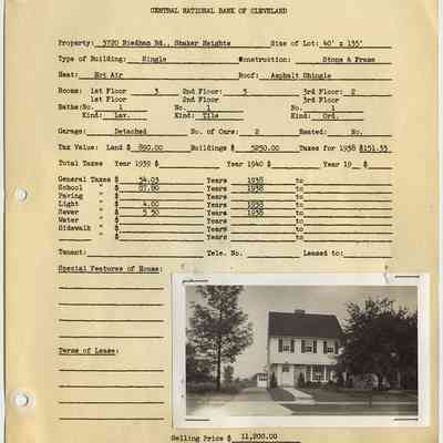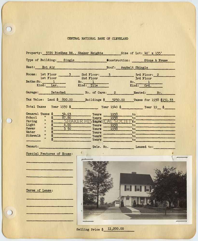 Appraisal form for 3720 Riedham Road in Shaker Heights prepared by Central National Bank of Cleveland. Property data reflects construction and 1938 tax records with a photograph of the property taken in 1940.Collection