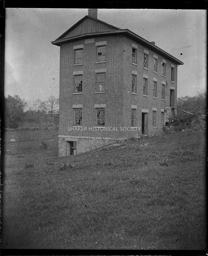 Glass plate negative showing a southwest view of the Center Family's woolen mill of the North Union Shaker Village, with many windows broken and in disrepair.Photograph Details
