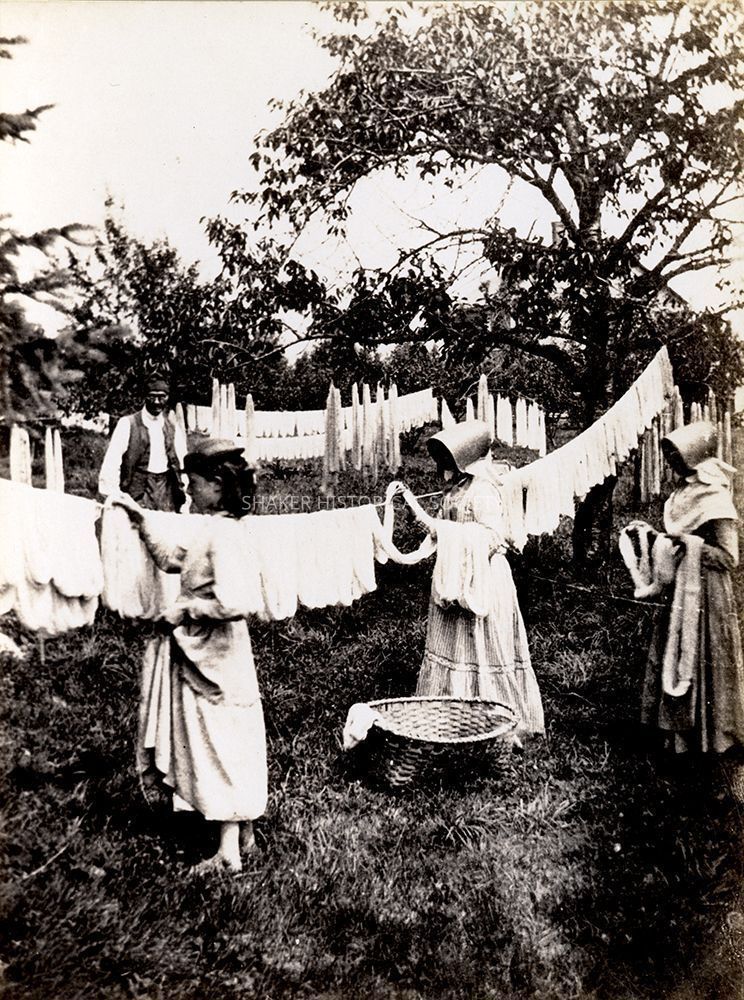 Plate 66 from from Shakers & Kirtland by Louis Baus showing North Union Shaker women hanging bleached wool on clotheslines.