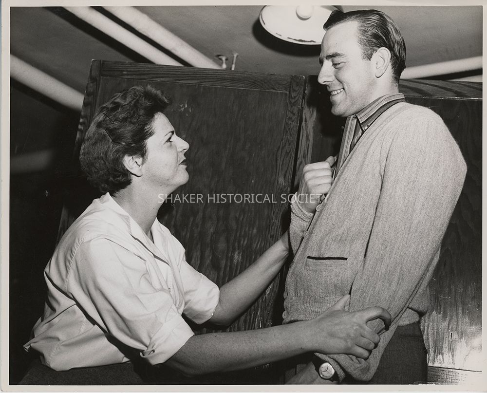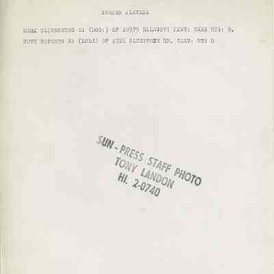 Black-and-white theatrical publicity photograph by Tony Landon of the Sun Press showing Shaker Players cast members Ruth Roberts and Mark Silverberg in "Come Back, Little Sheba." Identifying information on verso.Photograph Details