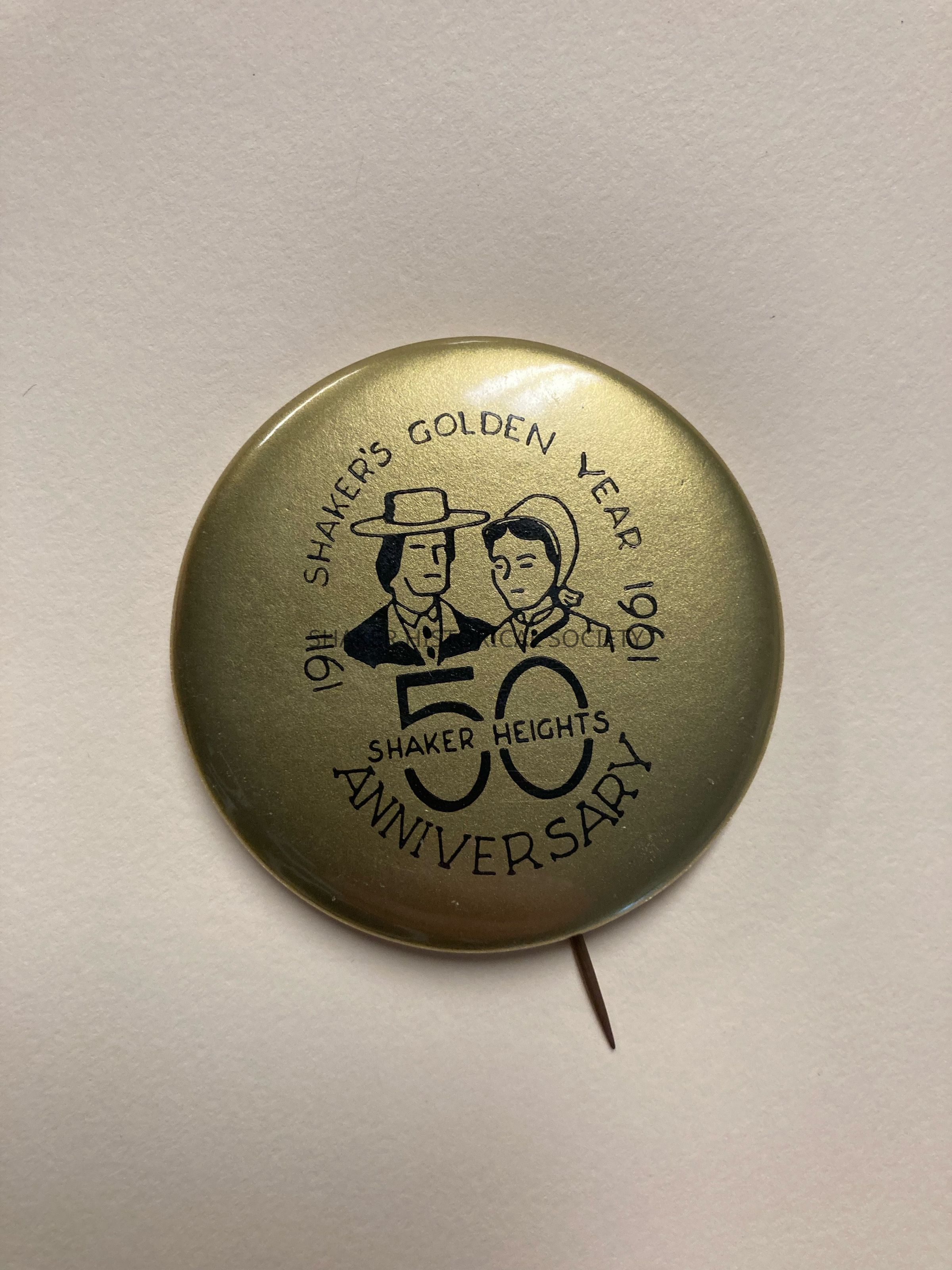 Gold 50th anniversary button featuring a logo of a Shaker man and woman.Acquisition