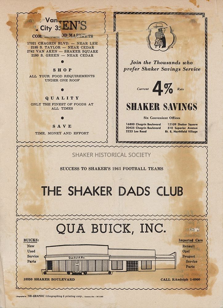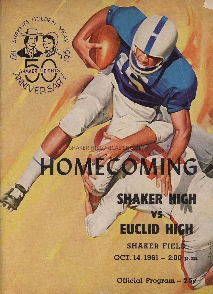 50th anniversary homecoming program for the Shaker Heights High School vs. Euclid High School football game taking place on the Shaker field on October 14, 1961. Includes brief articles on the city's history and highlights Lois Vance's winning design for the city seal contest.Acquisition