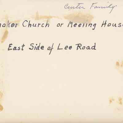 Undated black-and-white photograph of the North Union Shaker Meeting House (church) located along Lee Road. Handwritten caption on verso reads: "Shaker Church or Meeting House, East Side of Lee Road."Photograph Details