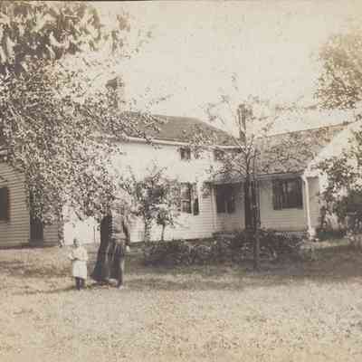Recto: Photo of a woman and child in front of an unidentified white house with an illegible note written in white in the bottom margin.