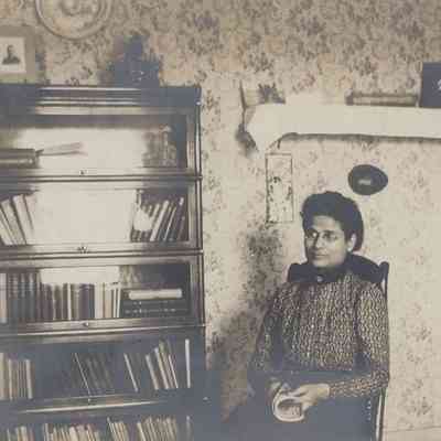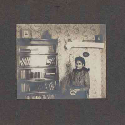 Verso: Photo of an unidentified woman, likely Mary or Louisa Litzel, sitting in a chair next to a bookshelf. Room is possibly the interior of Hornet's Nest School. Woman is also pictured in the same room in 2025.13.874.Photograph Details