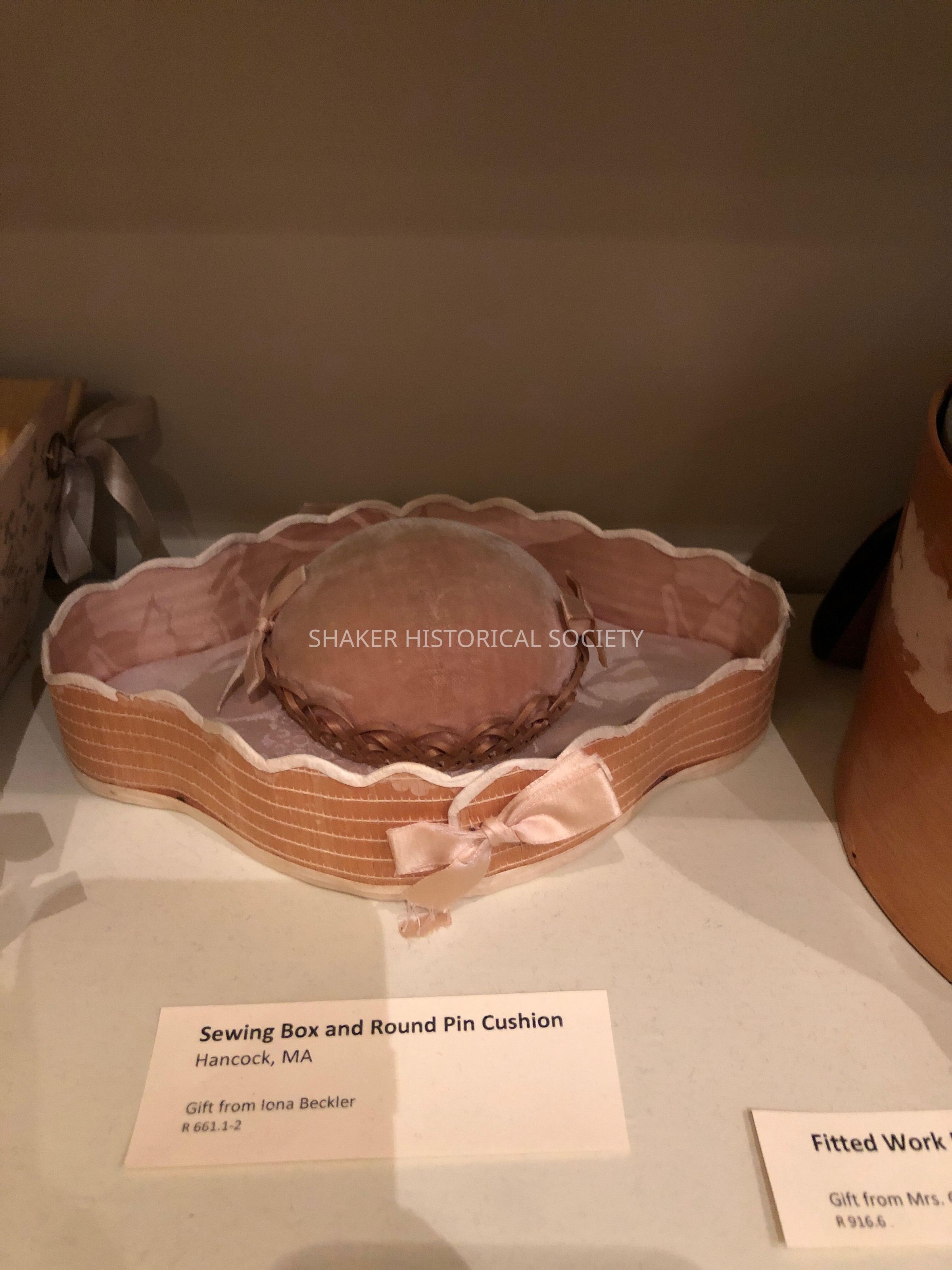 Sewing box with scalloped edge and lined with pink brocade. Contains pink velvet pin cushion from Hancock, Massachusetts.Collection
