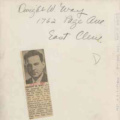 Black-and-white headshot of Shaker Players cast member Dwight W. Way from "Say, Darling." Identifying information on verso.Photograph Details