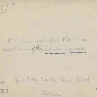 Black-and-white photograph showing an east view of the hemlock grove along present-day North Park Boulevard. Handwritten note on verso reads: "MacLean identifies this as an east view of the hemlock grove. Possibly North Park Blvd." Print was possibly made from a glass plate negative based on the blurred edges. Photo is identical to Plate 57 in Louis Baus' Shakers & Kirtland.Photograph Details