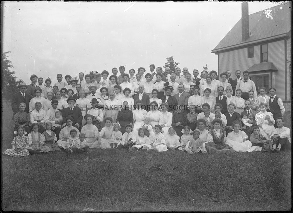 Glass plate negative showing the Hecker family reunion posing for a family photo on a lawn next to an unidentified house, likely one of the Heckers' properties along Fairmount Boulevard.Photograph Details