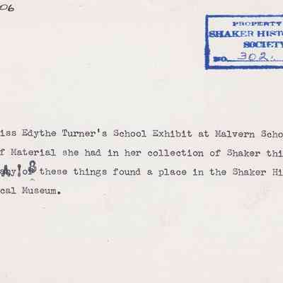 In 1924, Edythe Turner, a teacher at Malvern School, began implementing Shaker-focused activities in her classroom that grew into a district-wide third grade Shaker unit and a permanent collection of Shaker artifacts. With the help of Pearl Stark, another third grade teacher who pioneered the promotion of Shaker heritage in the schools, Turner provided engaging educational opportunities built on extensive research and community connections.Other Names and Numbers