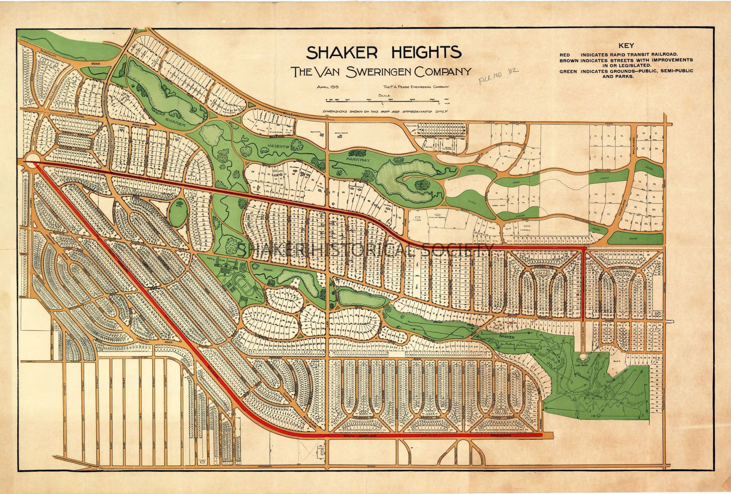 Color map of Shaker Heights created in April 1919 by the F. A. Pease Engineering Co., showing lots for sale by the Van Sweringen Company. Rapid transit lines are marked in red, and recreational areas appear in green. Sold lots near the Shaker Parklands are labeled with the owners’ names.Collection