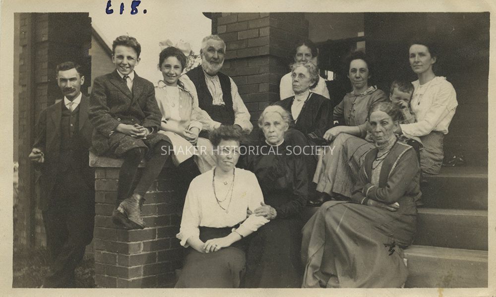 From bottom of the step to the top, the subjects are: Retta Wooward, Leora Warren Woodward, Mary Warren Van Dersluis [Vandersluis], Mary Steigerwald Tuttle, Myra Caley Gibbs, Donald C. Demcy [Dempcy], Celia Caley Demcy [Dempcy], [Sarah] Priscilla Warren Caley.Photograph Details