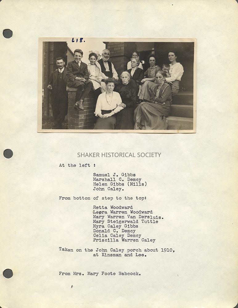 Black-and-white photograph of Warren descendants pasted into a Warrensville Township scrapbook (SCR WAR 5). The photograph was taken around 1910 on the John Caley porch at Kinsman and Lee Roads.