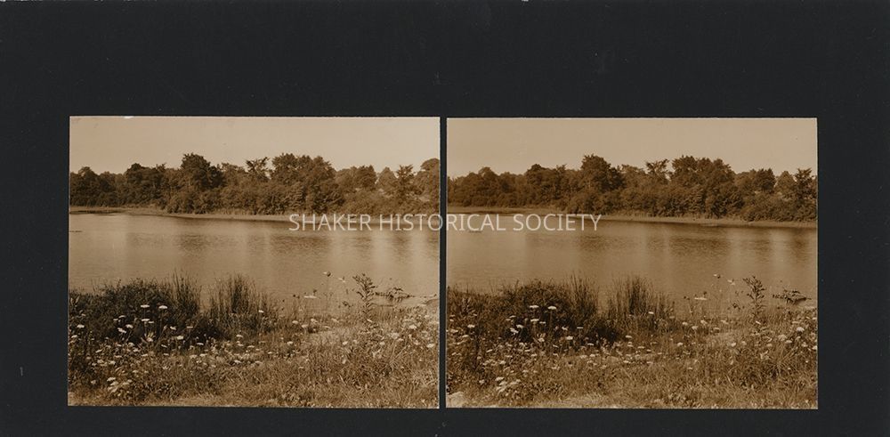 Sepia-toned black-and-white stereograph photographs by Ladis Lisy of one of the Shaker Lakes. Photographs are mounted on black board with handwritten notes on verso:
