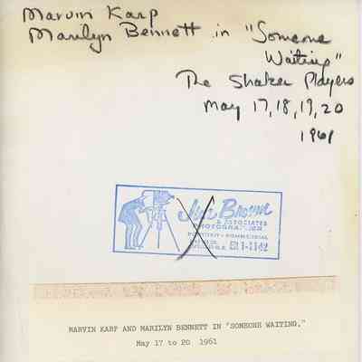 Black-and-white theatrical publicity photograph by Jim Brown & Associates photographers showing two Shaker Players cast members, Marvin Karp and Marilyn Bennett, in "Someone Waiting." Identifying information written on verso.Photograph Details